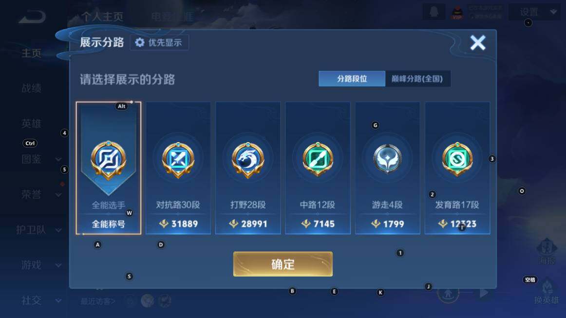 对抗30段,打野28段,7按键, 安卓Q-V7-125英雄-123皮肤-5传说-29史诗