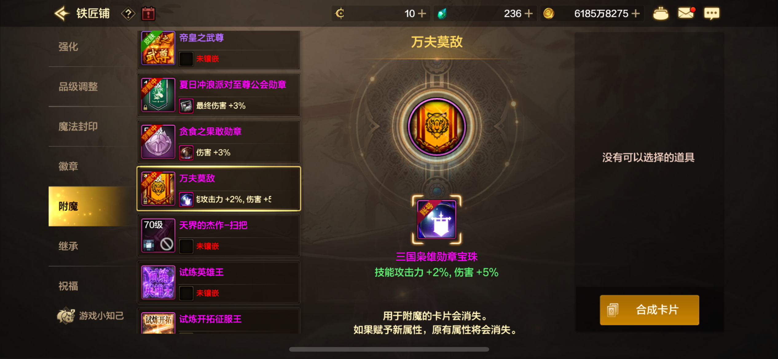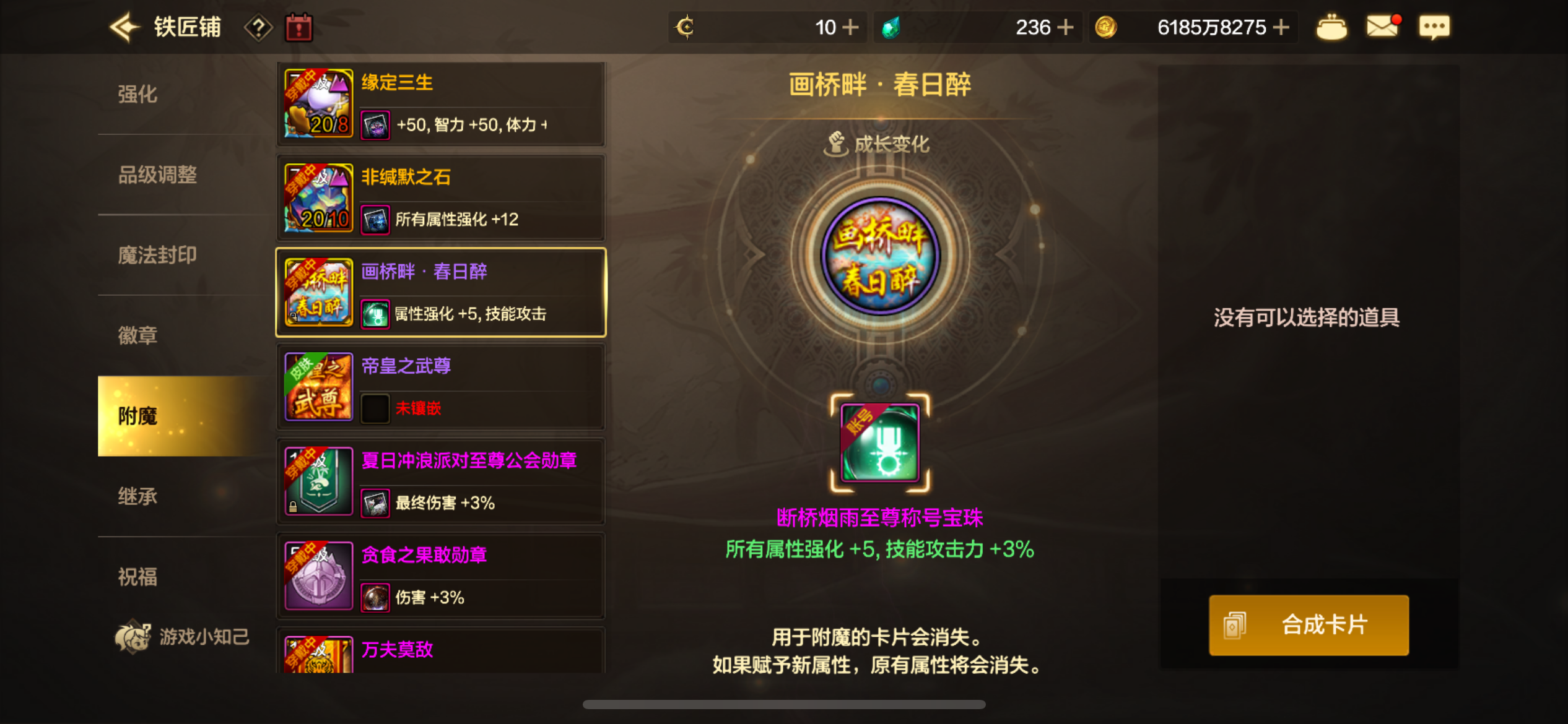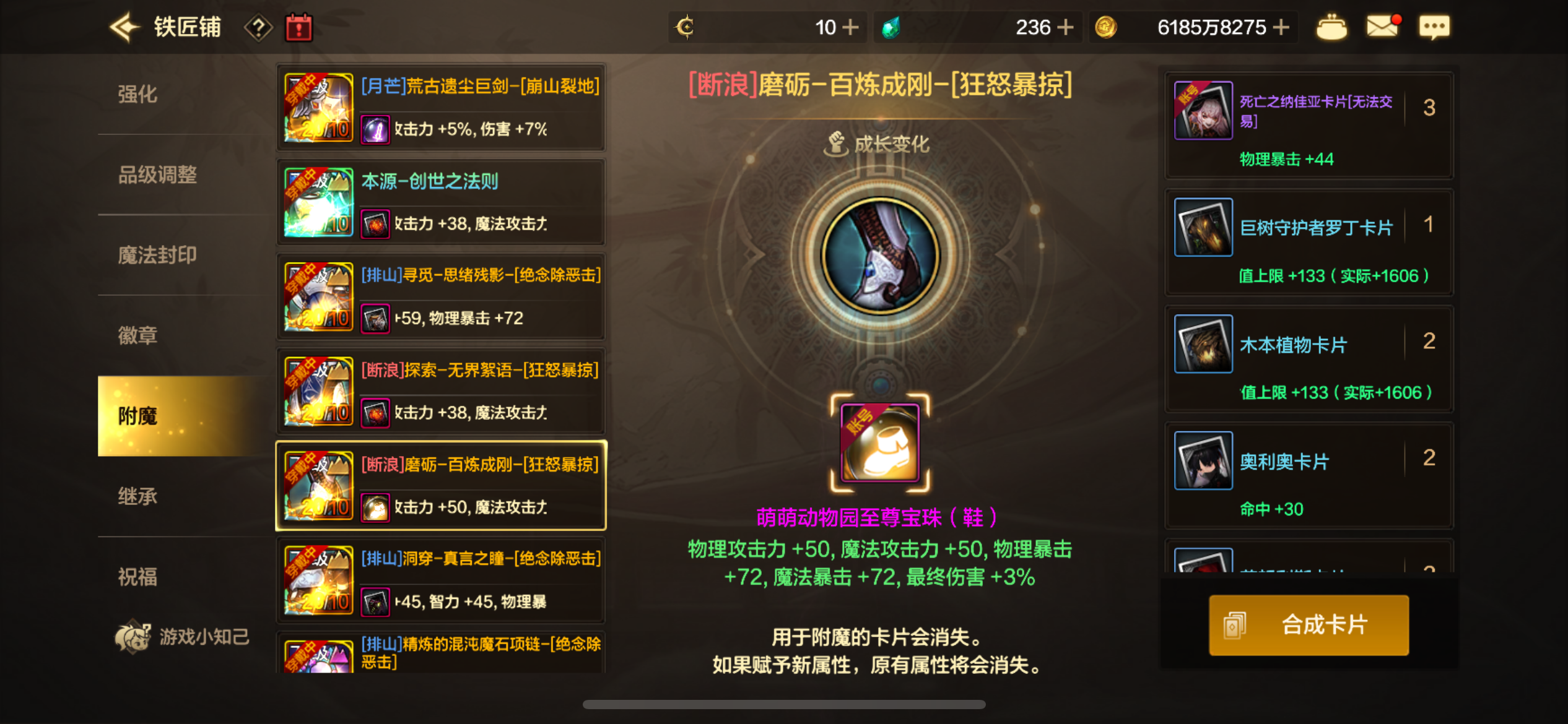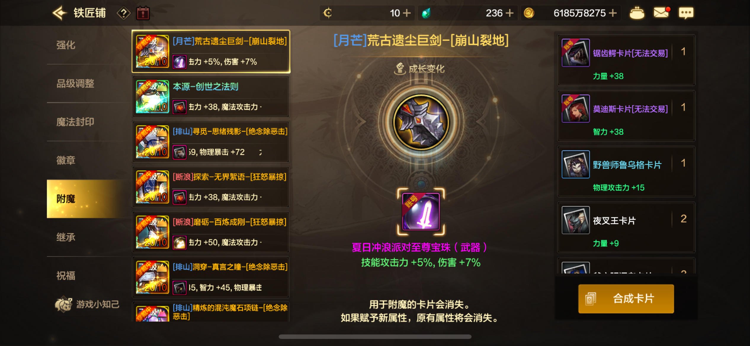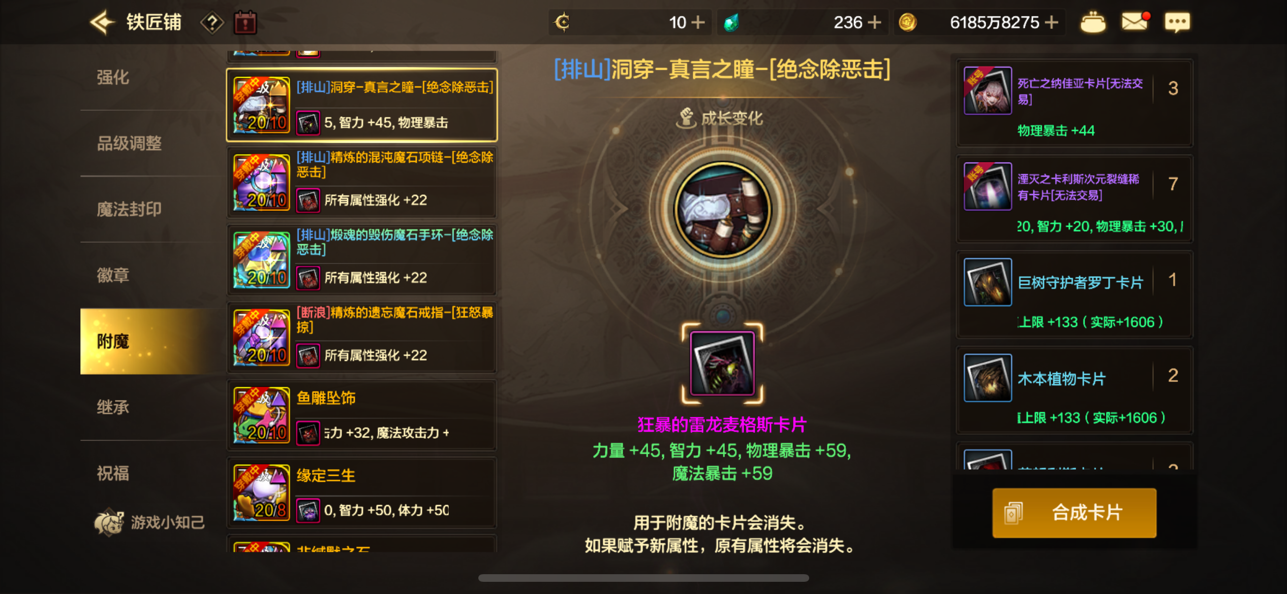 所有卡附魔都是最顶级的,还有团本宝珠。副c三尊三宝珠,五角色连体。全身10,差一件目前8,还有十多个胚子都有增幅,之前是11胚子上12失败了,玩几天就能全身10了。