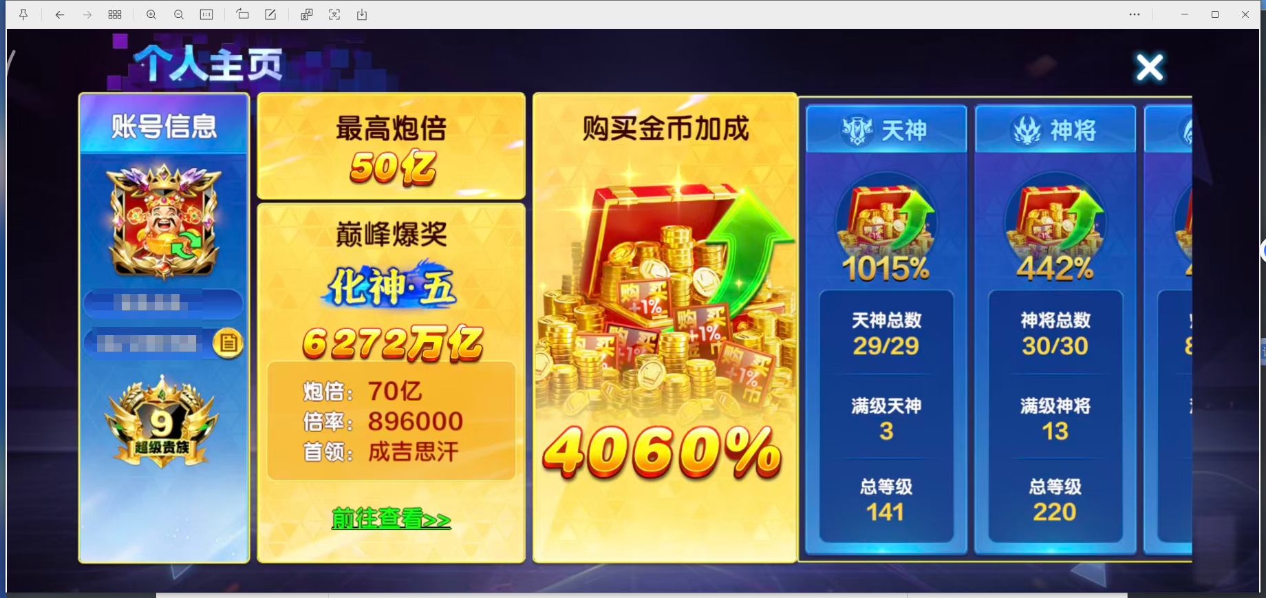 捕鱼大咖文字号 4060真实加成 s9 满天神满神将