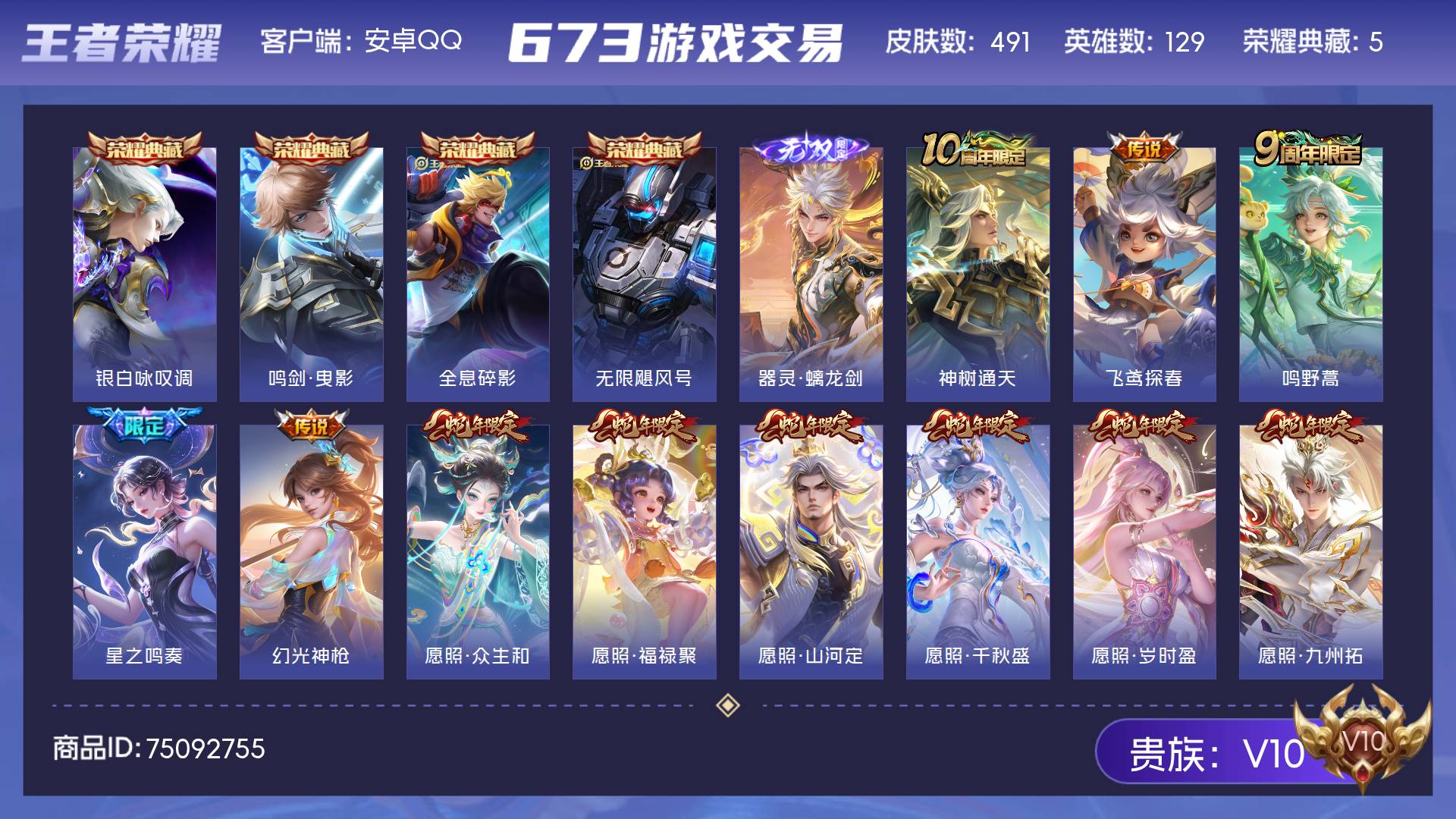 V10 皮肤491 英雄129 至尊星耀 荣耀典藏5 无双皮肤1 传说52 其他皮肤440