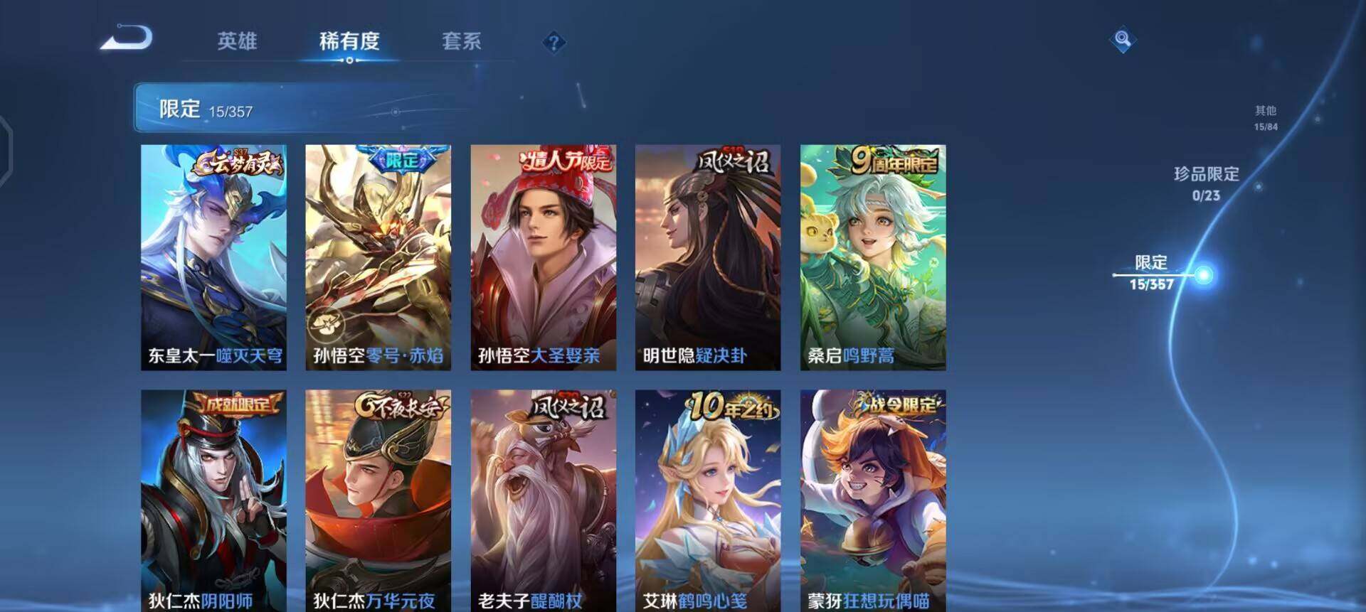 【限定皮肤】:狄仁杰阴阳师,狄仁杰万华元夜,项羽海滩派对,老夫子醍醐杖,孙悟空大圣娶亲,孙悟空零号赤焰,