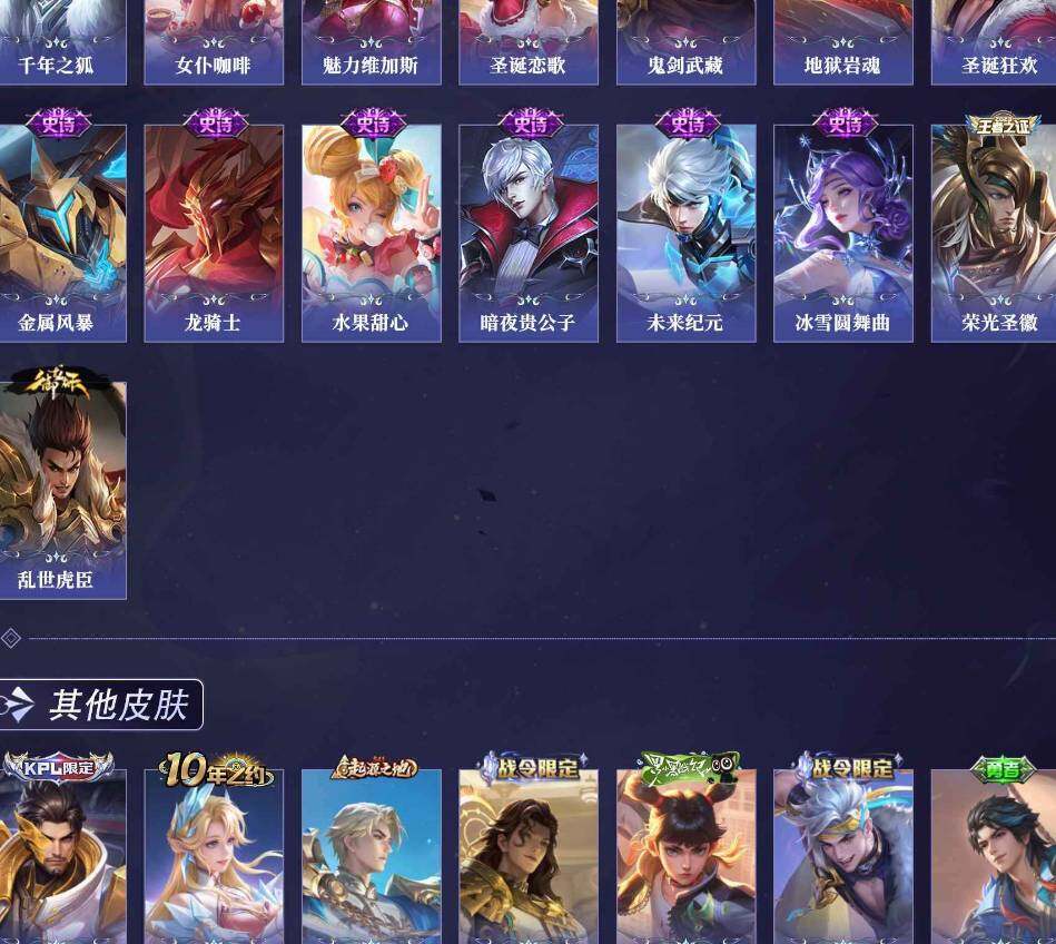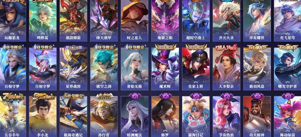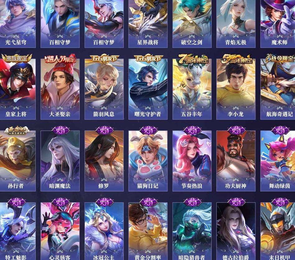 【限定皮肤】:姜子牙天穹之誓,狄仁杰阴阳师,赵云皇家上将,墨子神迹守卫,高渐离玩趣恶龙,狄仁杰魔术师,狄仁杰万华元夜,达摩沙漠行僧,项羽海滩派对,老夫子醍醐杖,老夫