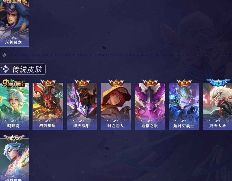 【传说皮肤】:桑启鸣野蒿,典韦战鼓燎原,孙悟空齐天大圣,赵云淬星耀世,铠绛天战甲,刘备时之恋人,宫本武藏地狱之眼,狄仁杰超时空战士