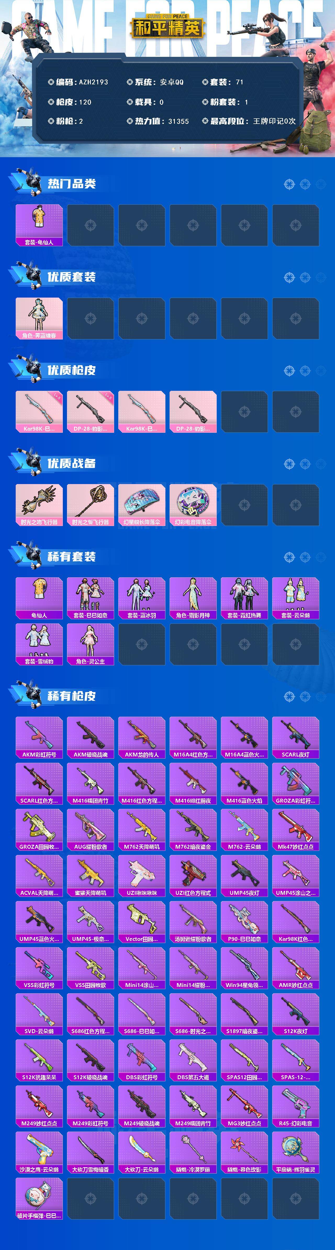 【AZH2193】安卓 手Q【霁蓝缠春 灵公主 满级DP-28-豹影疾电】1粉装-2特效枪-0载具-3粉色飞行器-31355热力值-1王牌印记-71套装-120枪皮