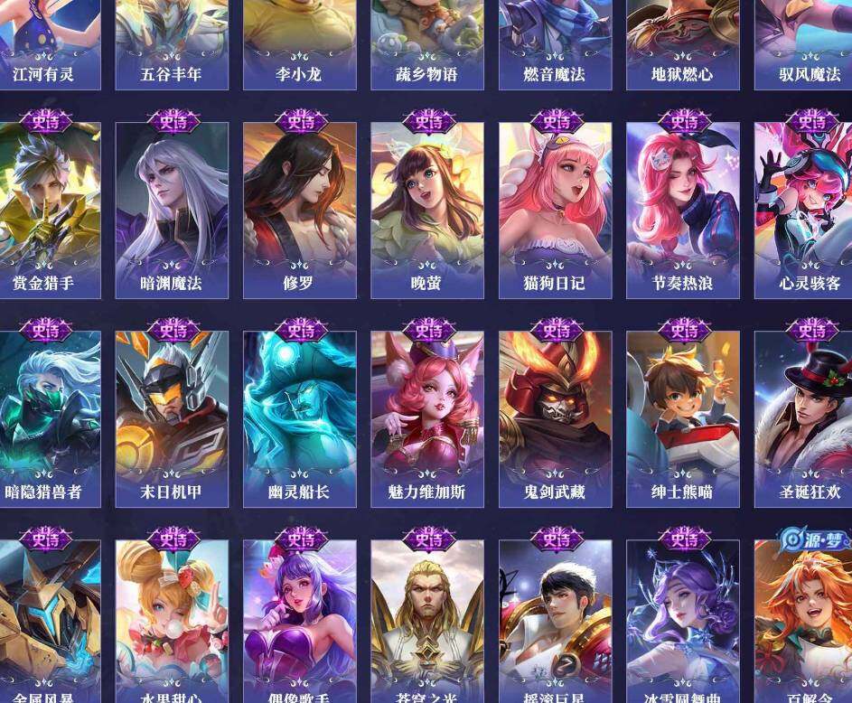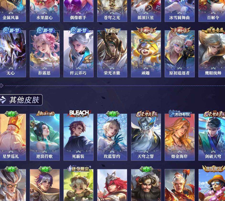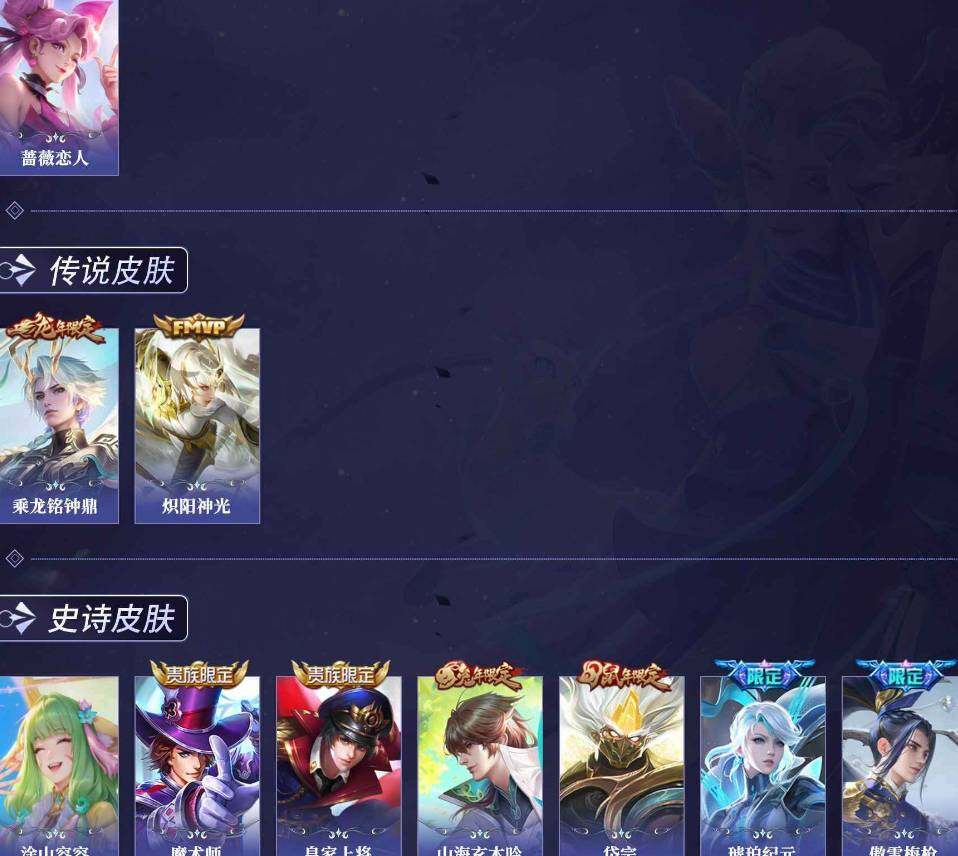 【限定皮肤】:姜子牙天穹之誓,狄仁杰阴阳师,赵云皇家上将,孙尚香蔷薇恋人,吕布猎兽之王,元歌无心,夏侯惇朔风刀,典韦岱宗,马可波罗山海玄木吟,狄仁杰魔术师,狄仁杰万华元夜,达摩沙漠行僧,项羽海滩派对,老夫子醍醐杖,韩信傲雪梅枪,兰陵王金庭之子,李元芳云