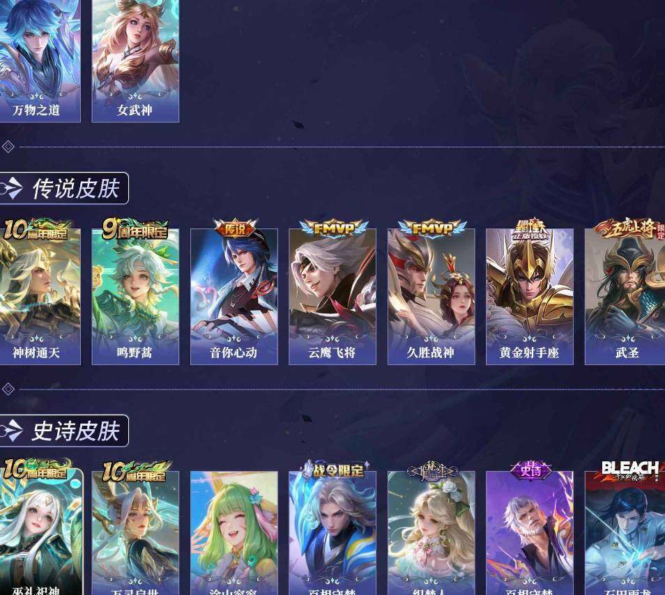 【传说皮肤】:后羿神树通天,桑启鸣野蒿,周瑜音你心动,关羽武圣,曜云鹰飞将,干将莫邪久胜战神,后羿黄金射手座