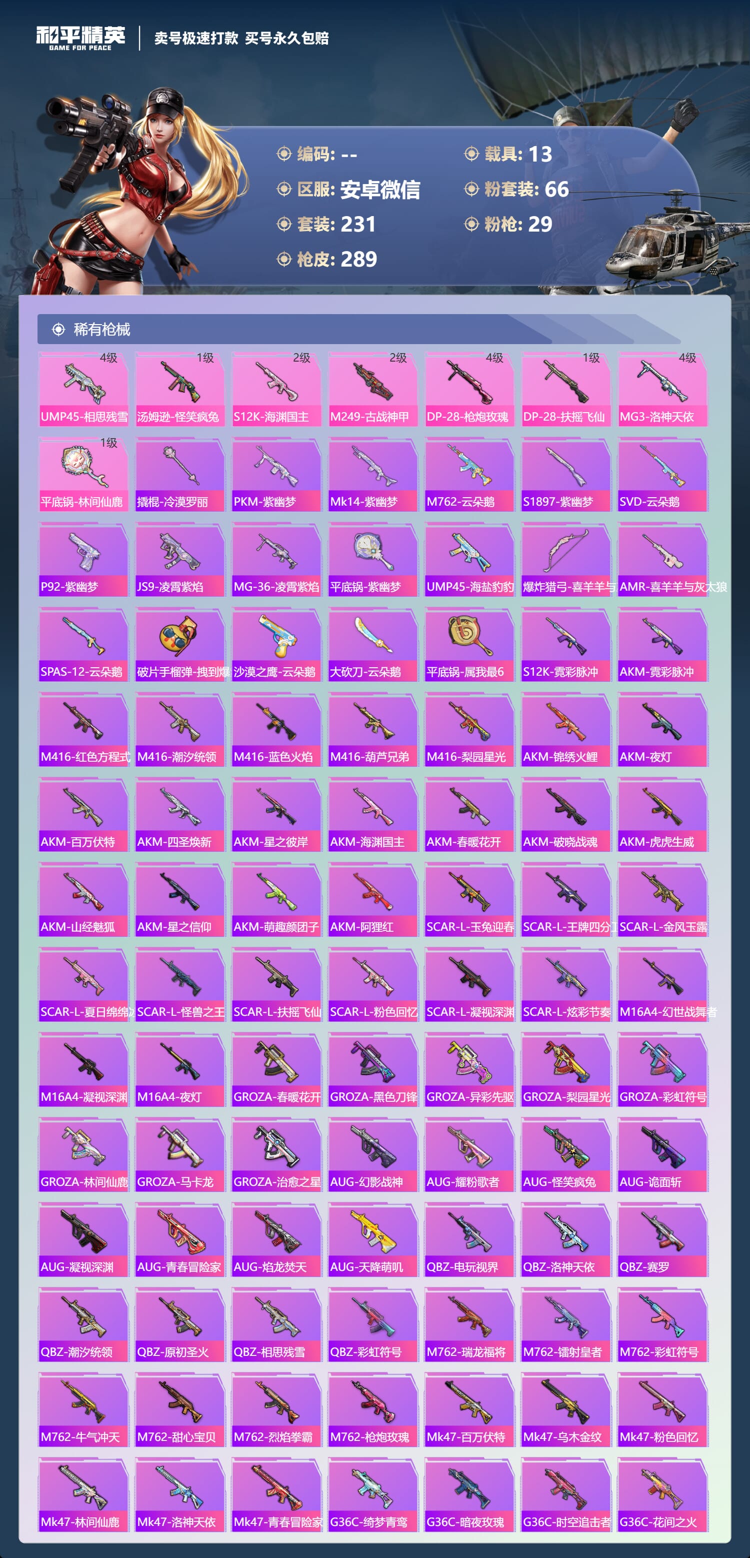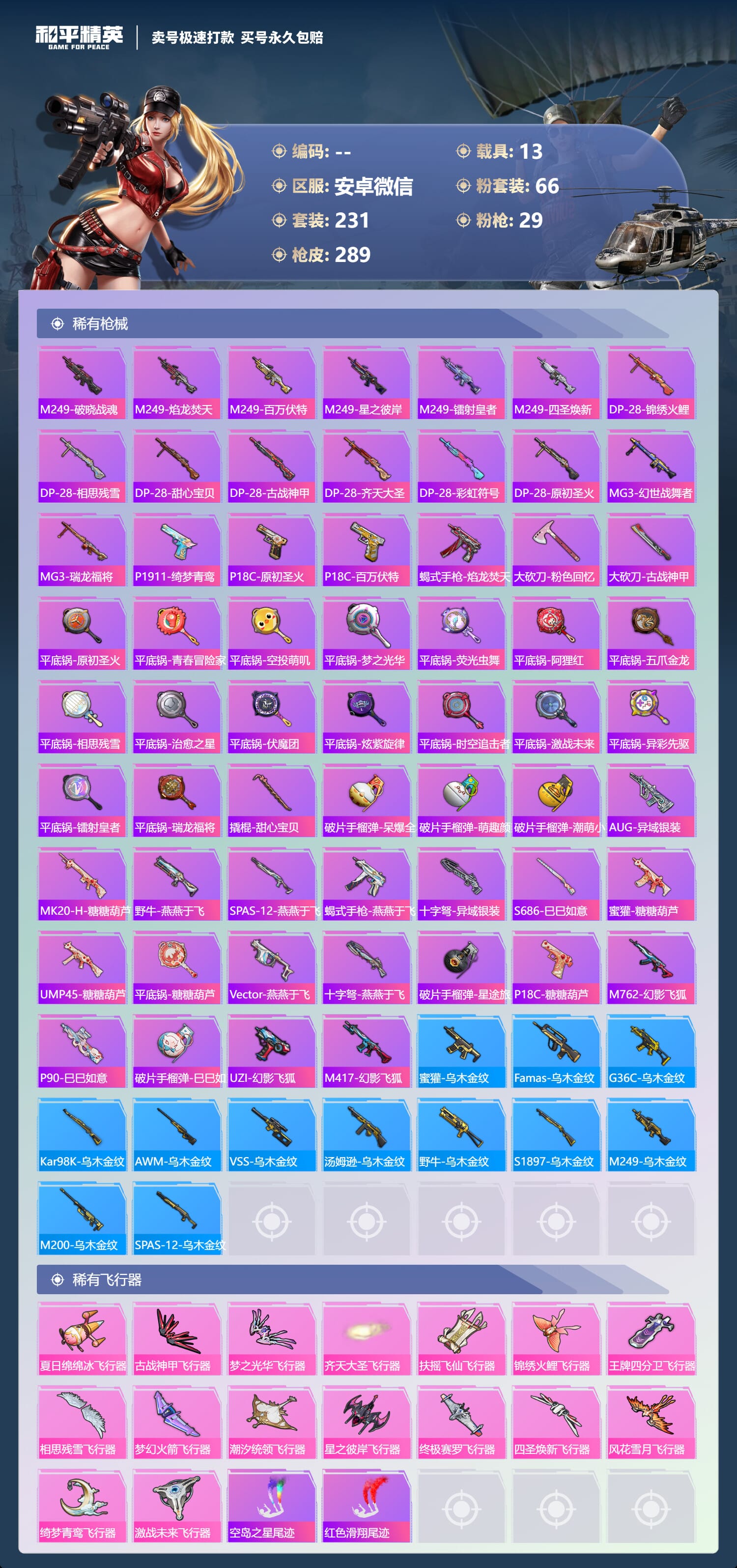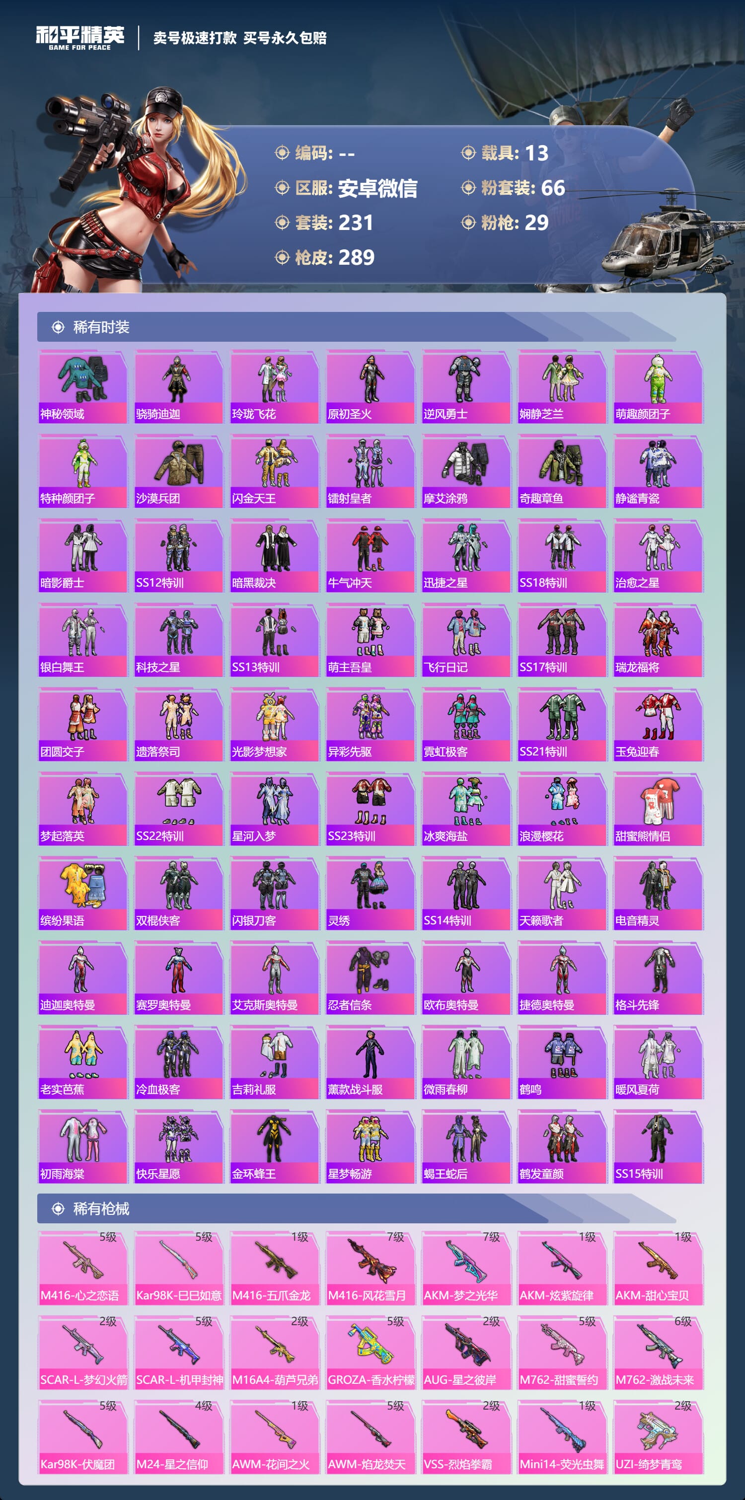 安卓微-10王牌印记-66粉装-29特效枪-13载具-150157热力值-231套装-289枪皮-