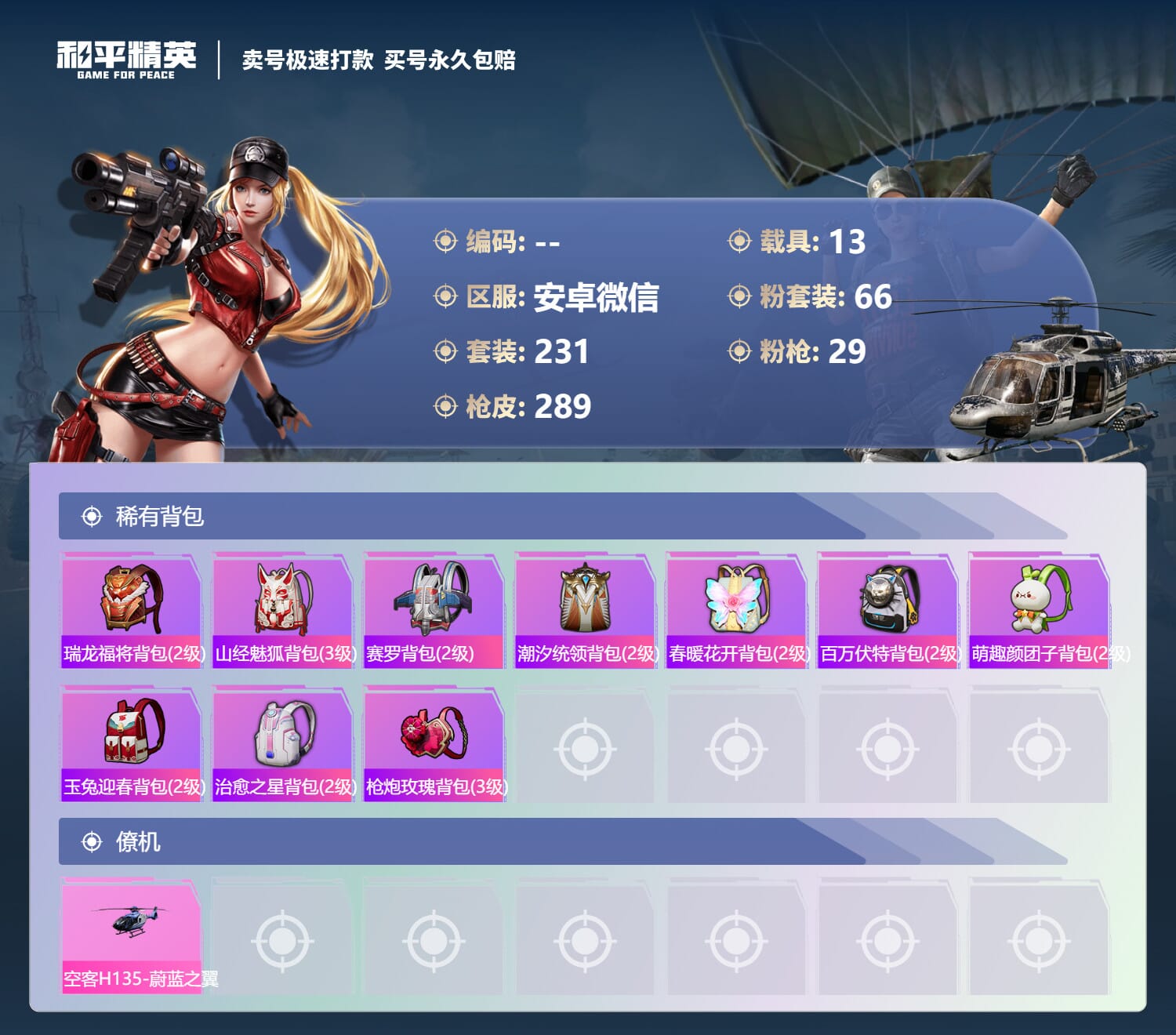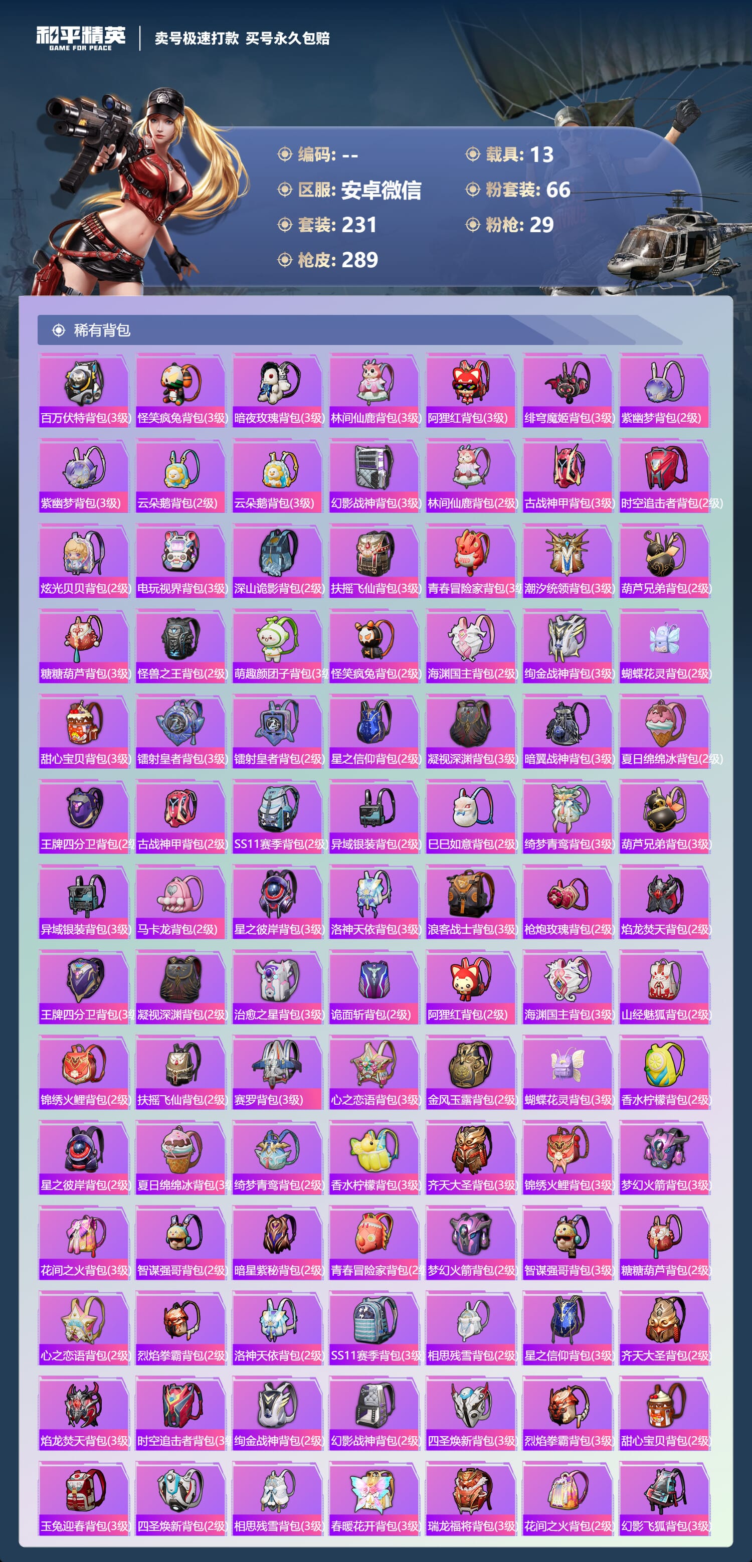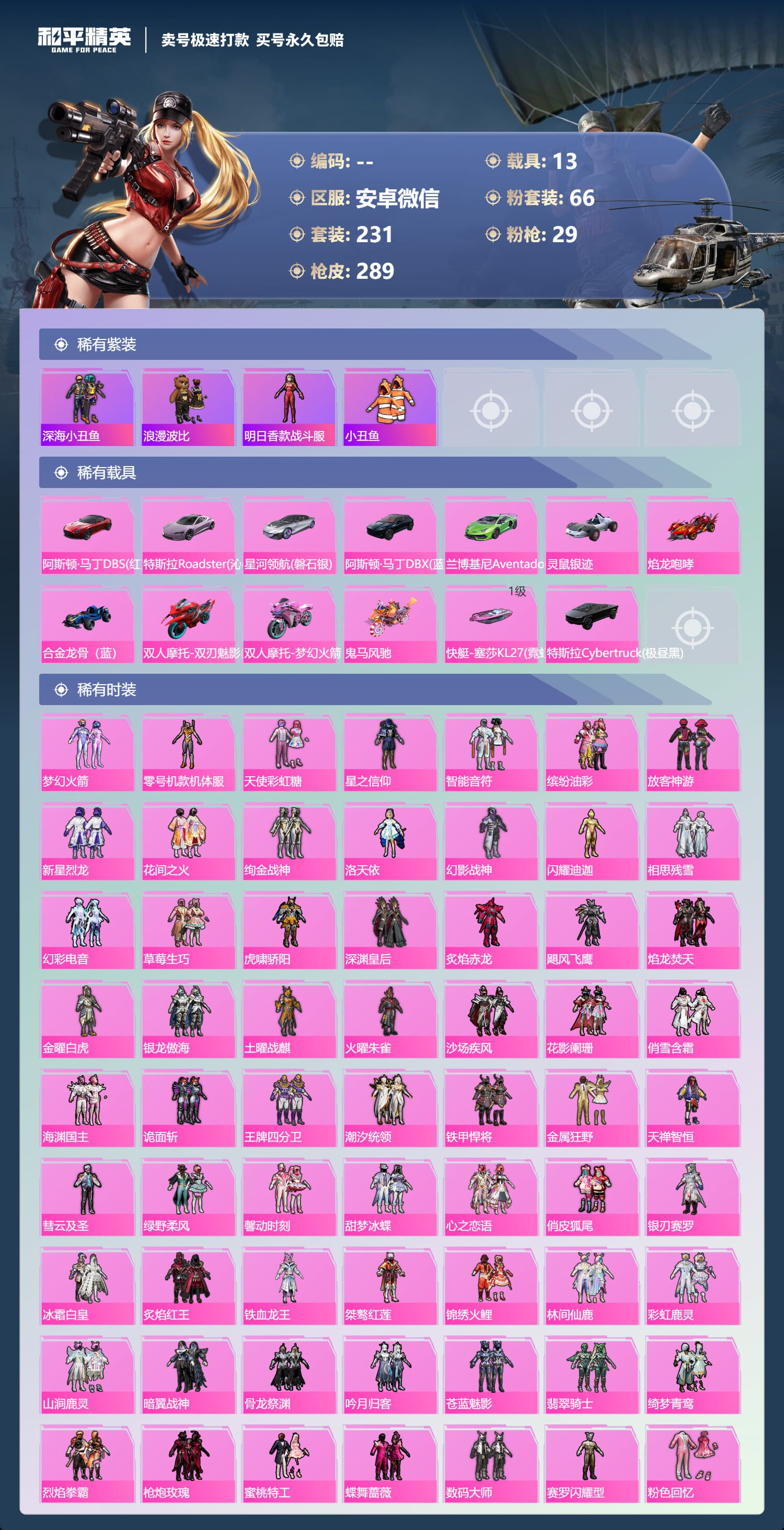 安卓微-10王牌印记-66粉装-29特效枪-13载具-150157热力值-231套装-289枪皮-