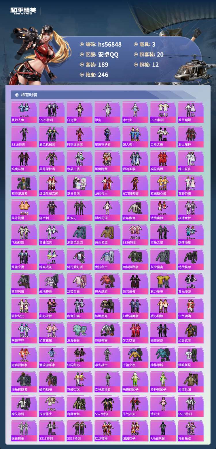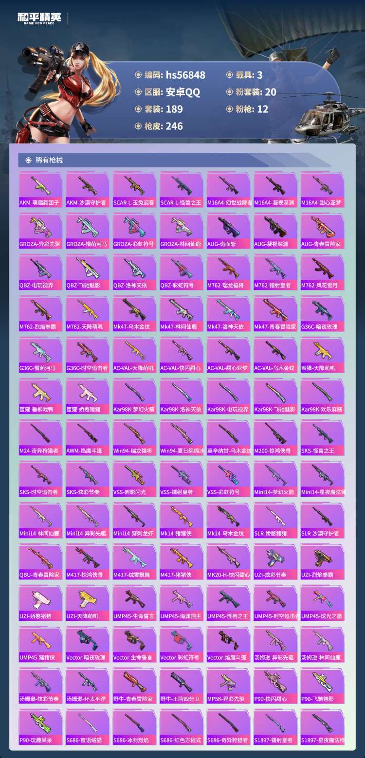 hs56848安卓手Q-7王牌印记-20粉装-12特效枪-3载具-93867热力值-189套装-24
