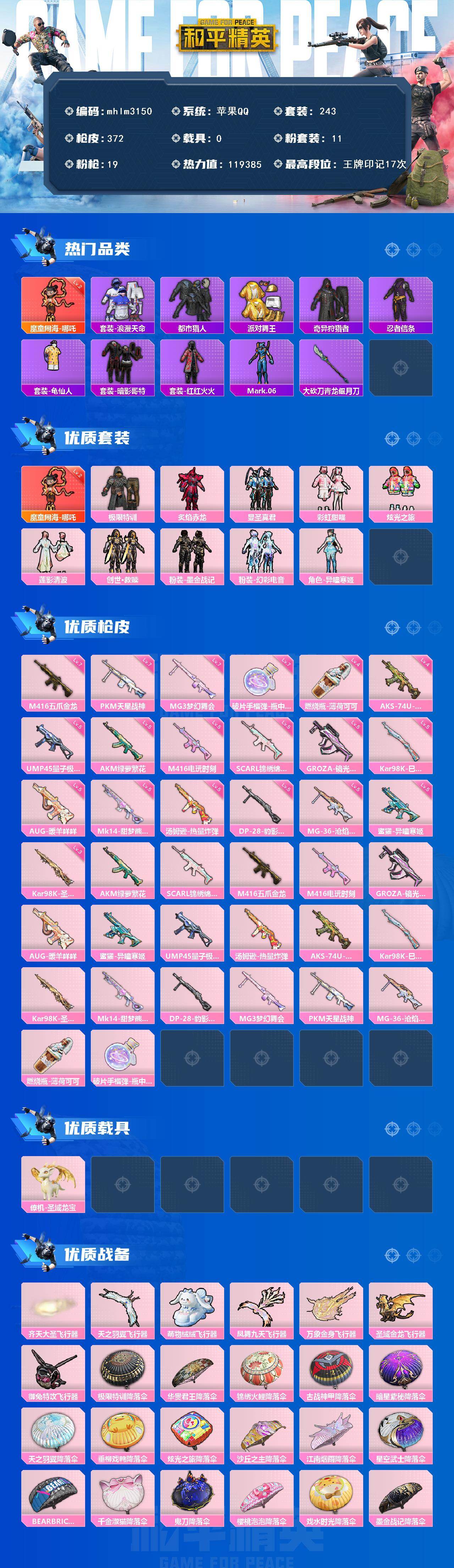 【mhlm3150】苹果 手Q-1神装-11粉装-19特效枪-0载具-9粉色飞行器-119385热力值-17王牌印记-243套装-372枪皮