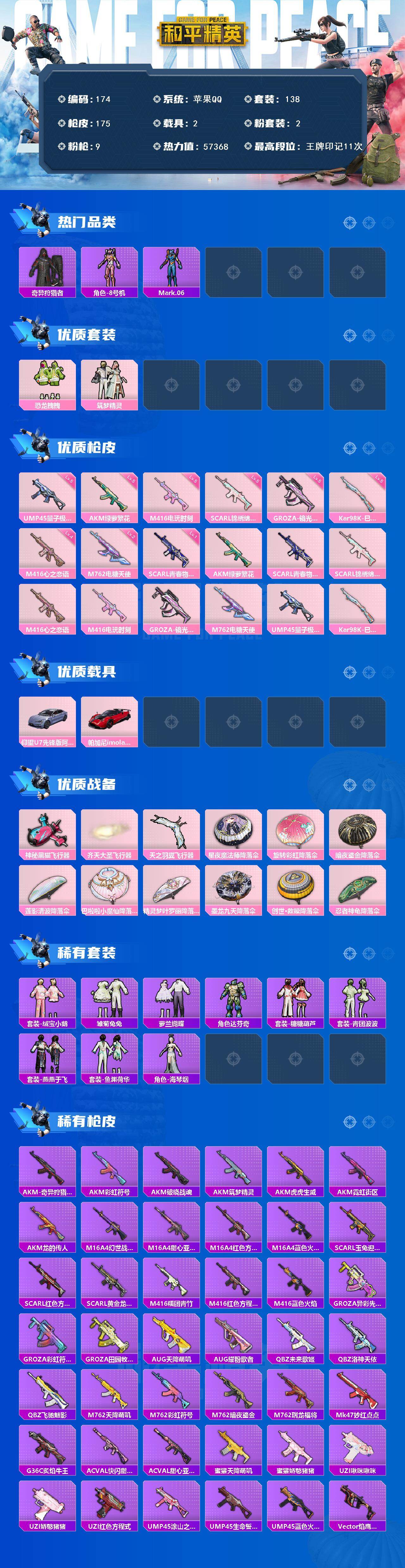 苹果 手Q-2粉装-9特效枪-2载具-3粉色飞行器-57368热力值-11王牌印记-138套装-175枪皮