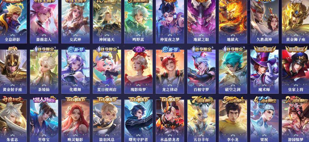 【限定皮肤】:白起狰,蔡文姬夏日便利店,虞姬夏日便利店,姜子牙天穹之誓,狄仁杰阴阳师,虞姬凯尔特女王,赵云皇家上将,