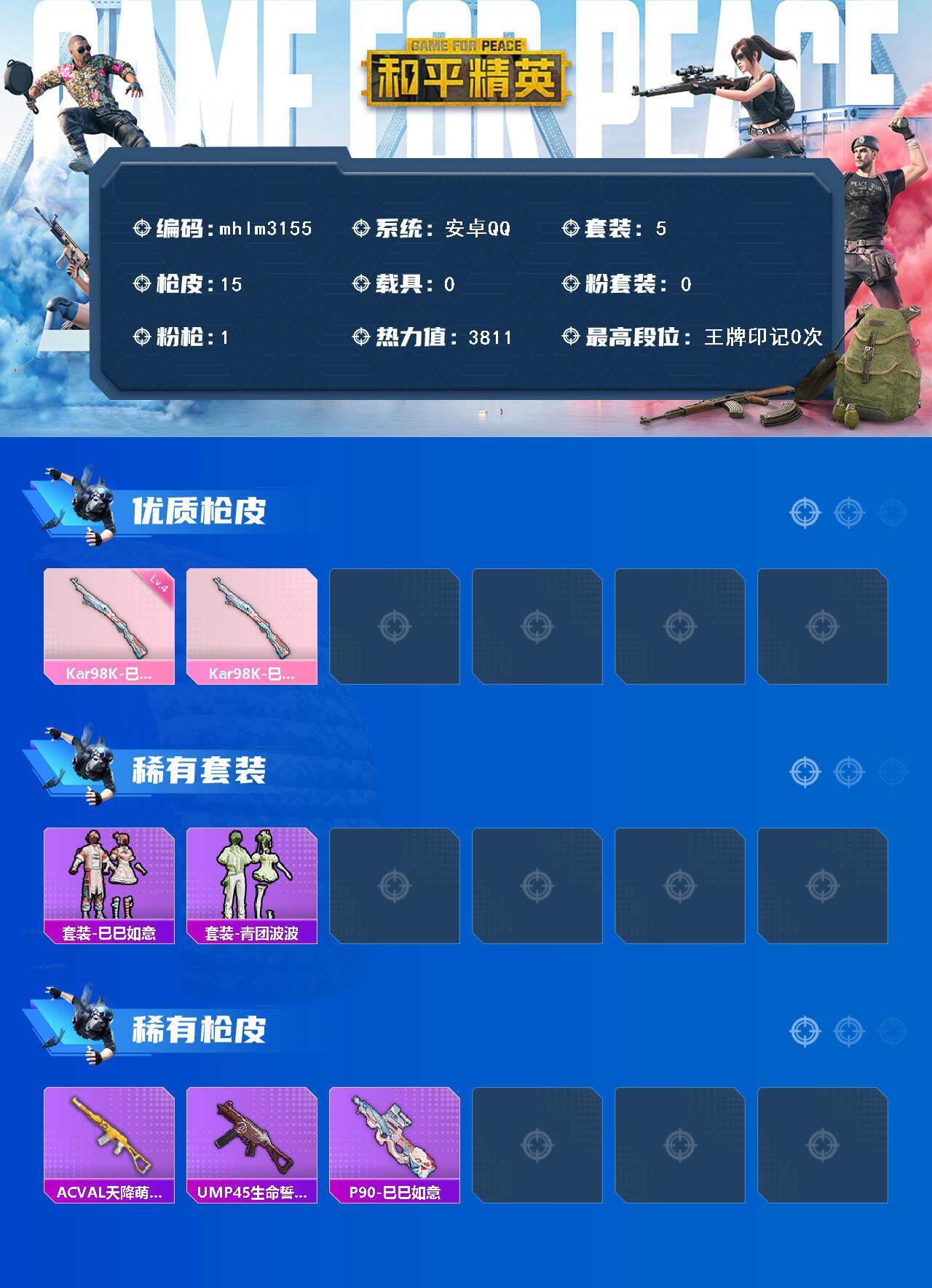 【mhlm3155】安卓 手Q-0粉装-1特效枪-0载具-0粉色飞行器-3811热力值-0王牌印记-5套装-15枪皮