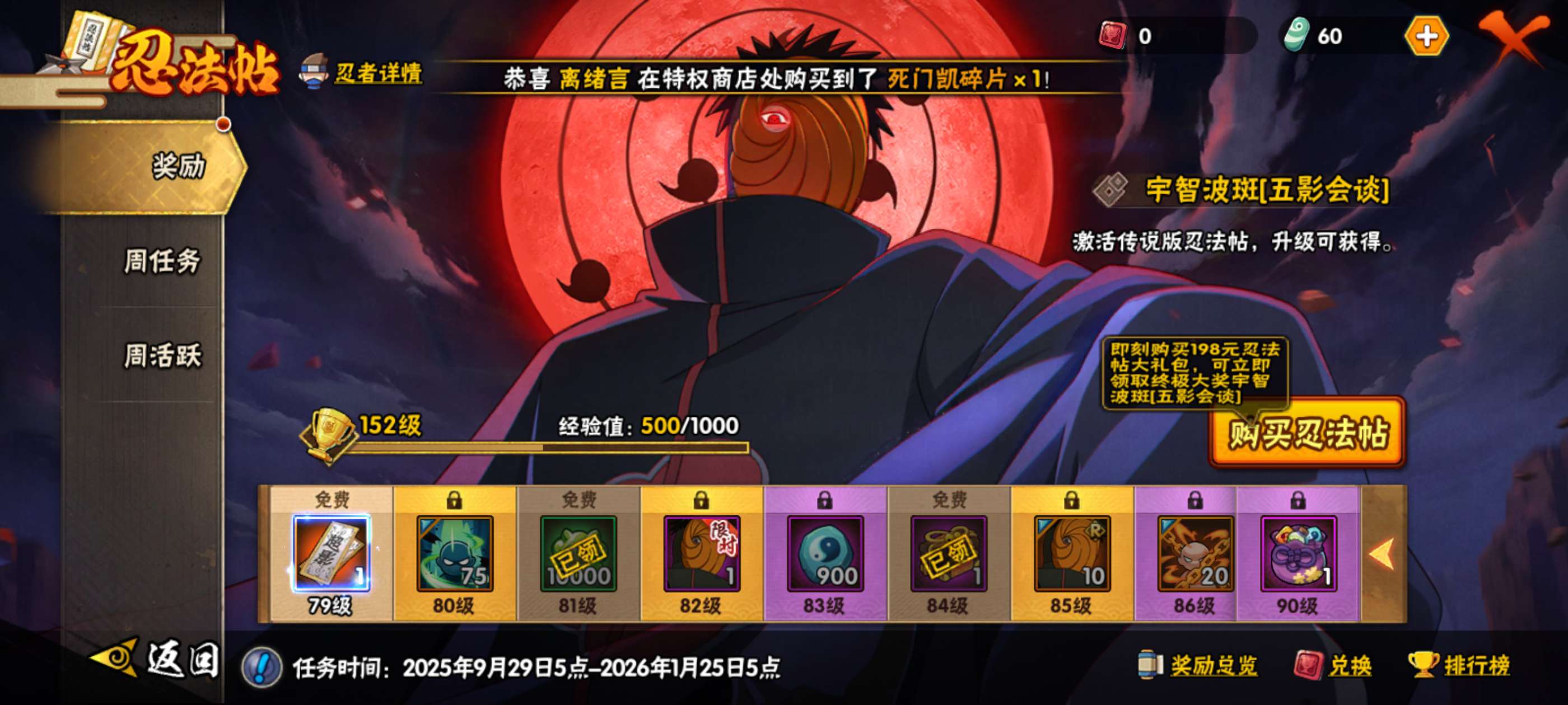 号上有10万的金币!10万的金币!77张高招劵,3000限时也有,七天超影,有秽土柱间75片白面具