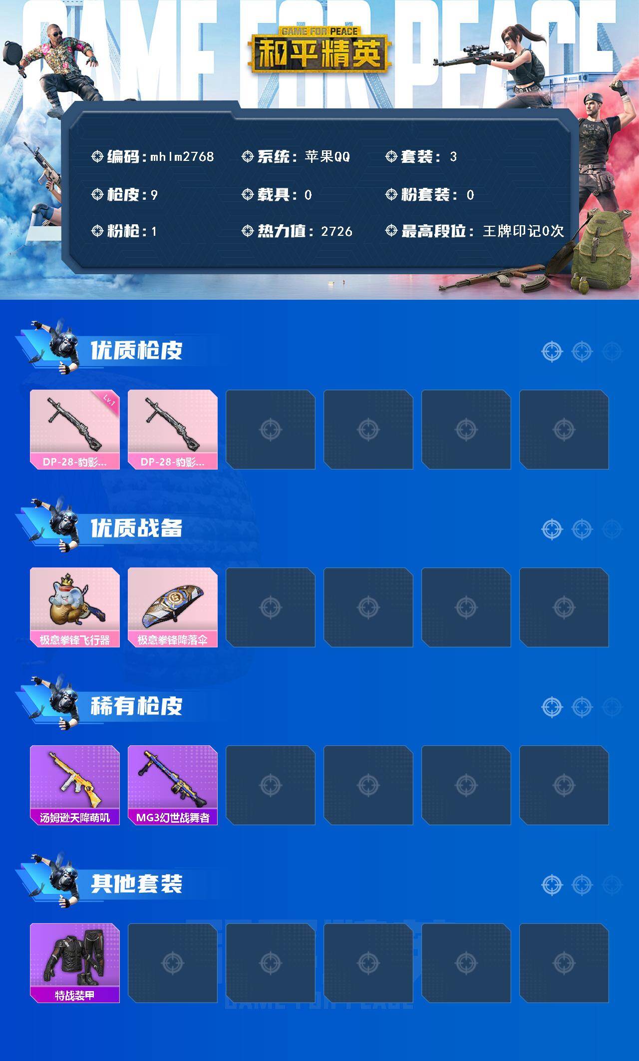 【mhlm2768】苹果 手Q-0粉装-1特效枪-0载具-1粉色飞行器-2726热力值-0王牌印记-3套装-9枪皮