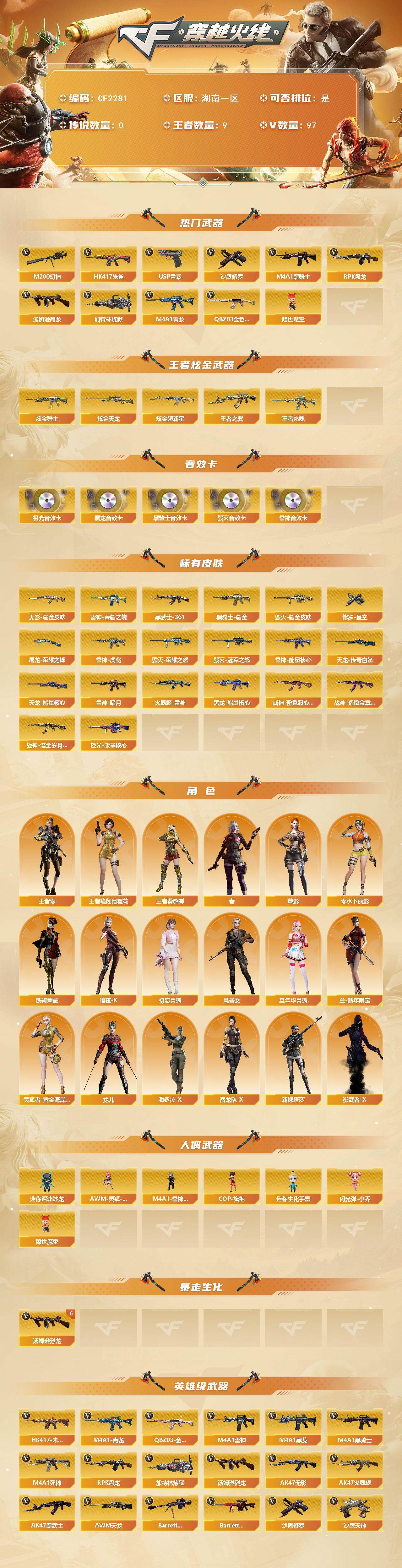 【CF2281】湖南一区-97V-9王者-4炫金【6烈龙】【M200-幻神】【AWM-裁决】【QBZ03-金色蔷薇】【AK47-雷暴】【M4A1-青龙】【HK417-朱雀】【USP-雷暴】【加特林-炼狱】【RPK-盘龙】【汤姆逊-烈龙】【春】【王者-葵-貂蝉】【王者-零】【王者-瞳-闭月羞花】【魅影】【M4A1-雷神】【雷神-荣耀之魄】【M4A1-雷神-白鲨皮肤】【雷神-虎将】【雷神-能量核心】【雷神-暗月】【M4A1-雷神音效卡】【AK47-火麒麟】【火麒麟-CFSTAR】【火麒麟-雷神】【M