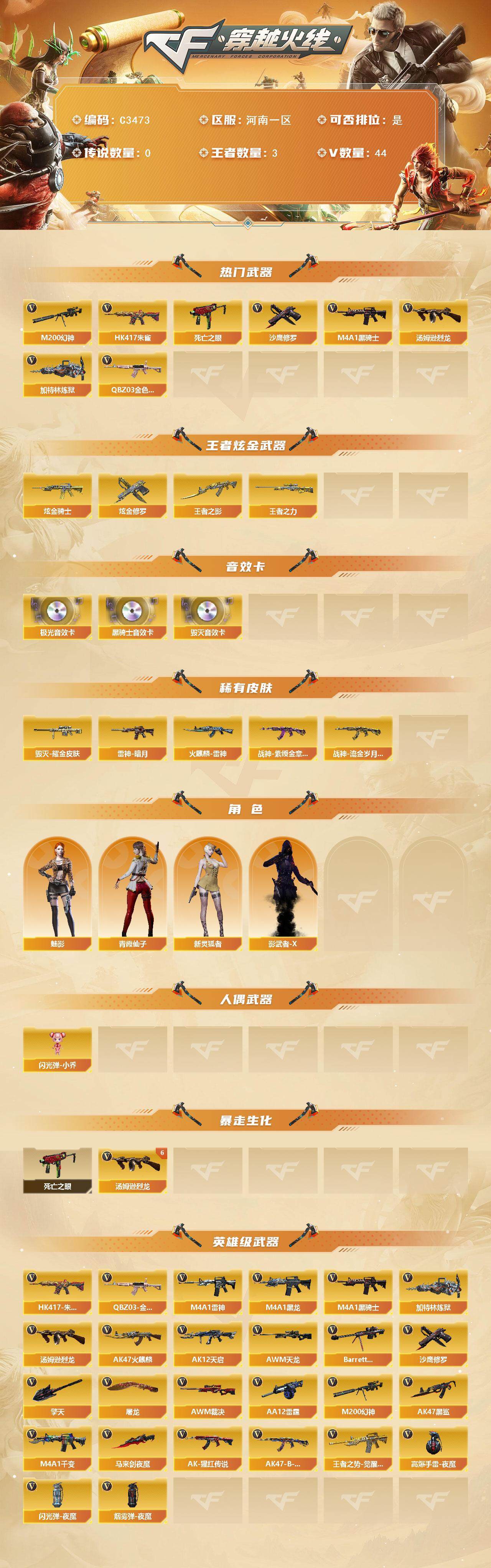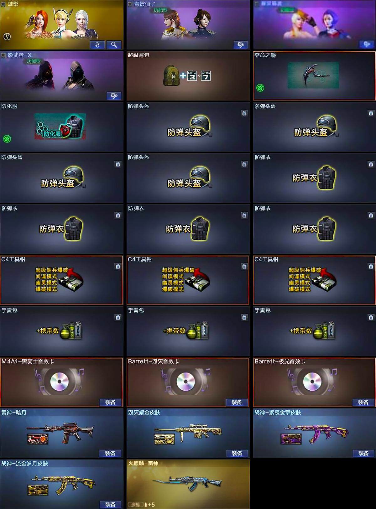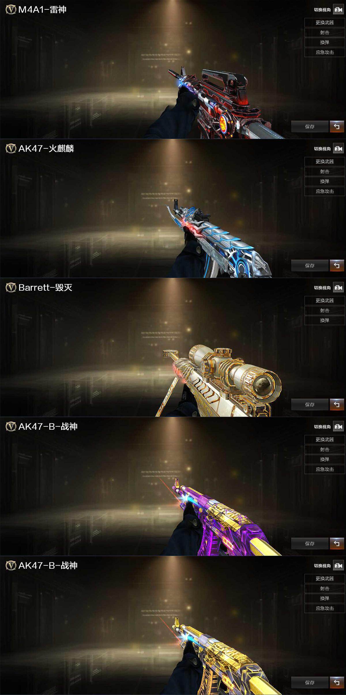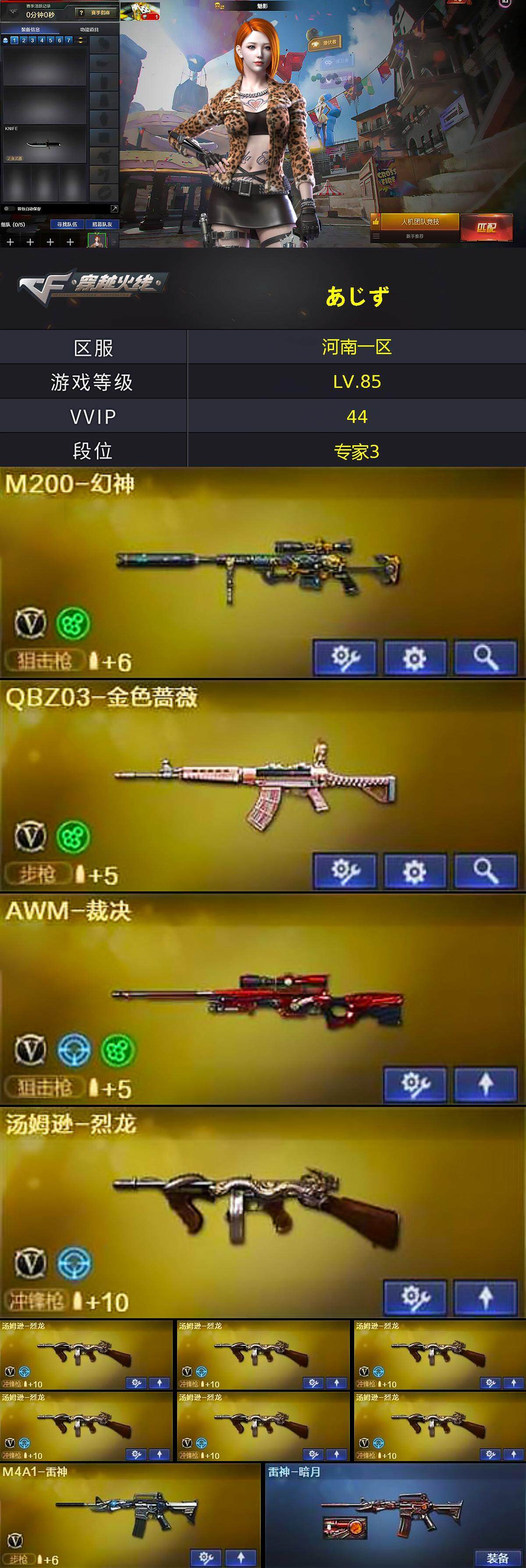 【热门武器】:QBZ03-金色蔷薇,HK417-朱雀,M200-幻神,死亡之眼,M4A1-黑骑士*2,汤姆逊-烈龙*7,加特林-炼狱*3,沙鹰-修罗