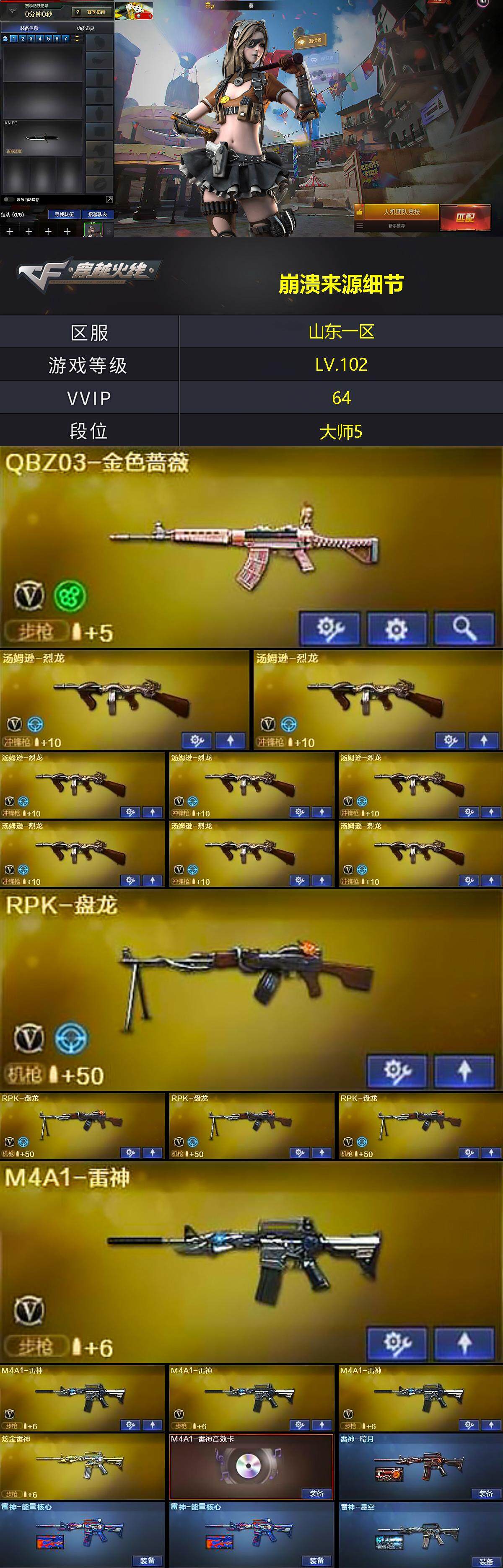 【CF2200】【双全号/QBZ03-金色蔷薇,死亡之眼,M4A1-黑骑士,汤姆逊-烈龙*8,RPK-盘龙*4,加特林-炼狱*6,沙鹰-修罗*3】山东一区-62V-7王者-5炫金