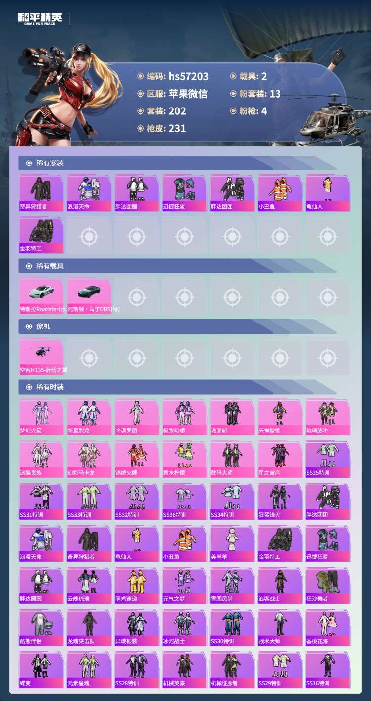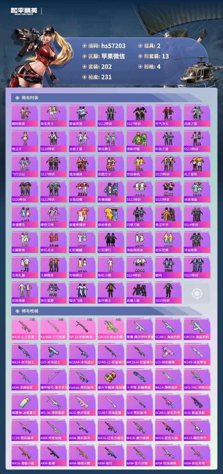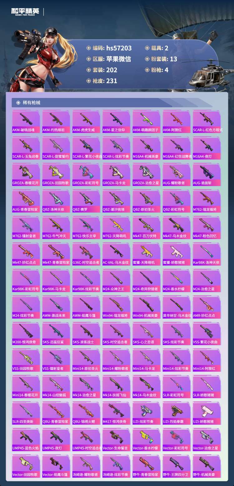 hs57203 苹果微-21王牌印记-13粉装-4特效枪-2载具-88401热力值-202套装-2
