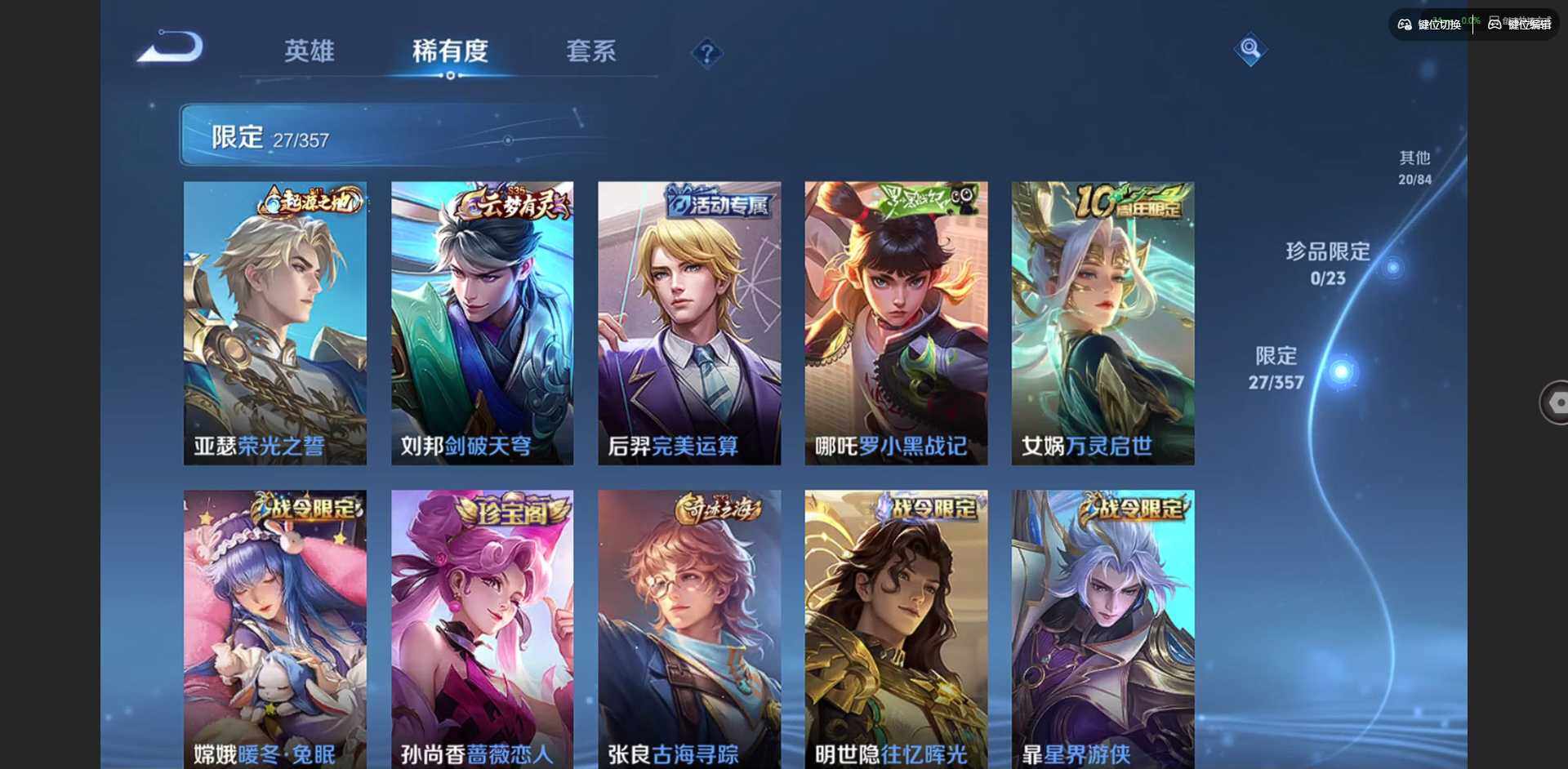 实名: 可修改 贵族等级: V6 英雄数: 120 皮肤数: 94 星传说: 星际治安官 传说皮: 炽阳神光,地狱之眼,超时空战士-狄仁杰 限定皮: 李小龙,诗剑行,山海·玄木吟