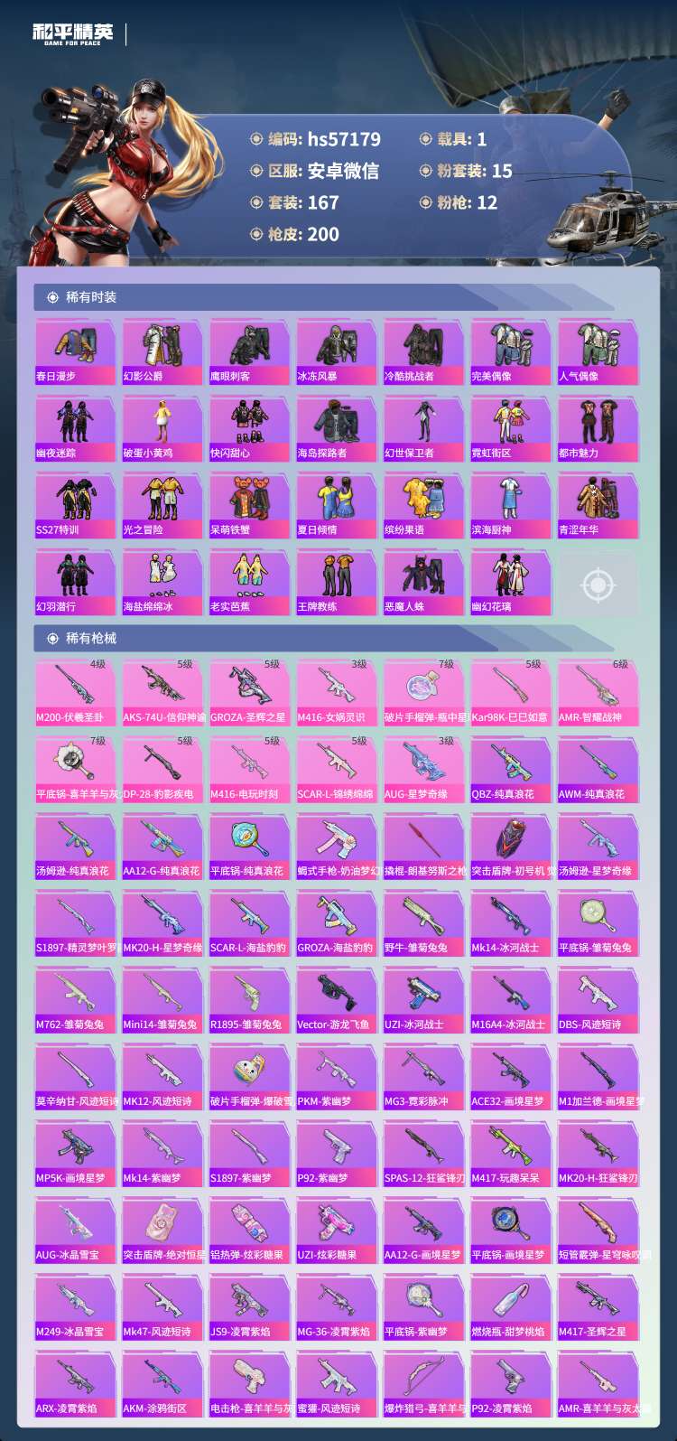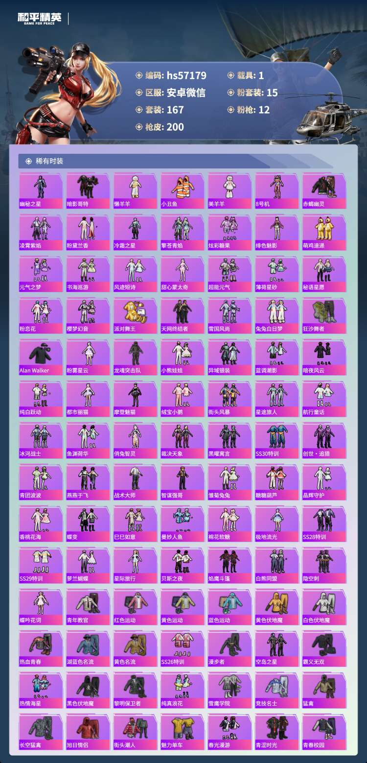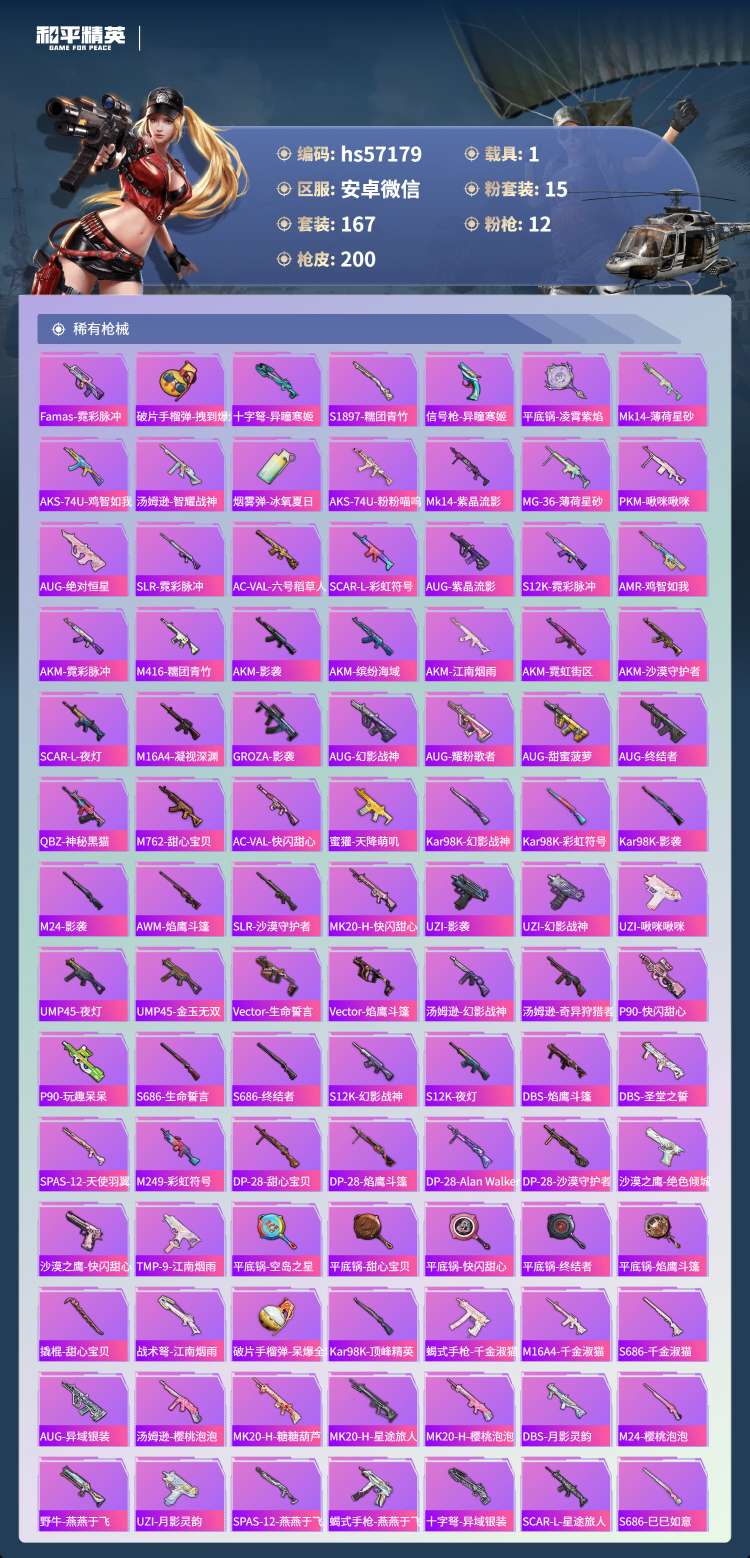 hs57179安卓微-11王牌印记-1红装-15粉装-12特效枪-1载具-71871热力值-167