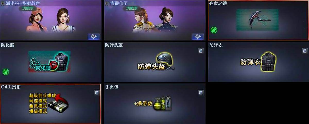 【道具】:夺命之镰,防化服,防弹头盔,防弹衣,C4工具钳,手雷包