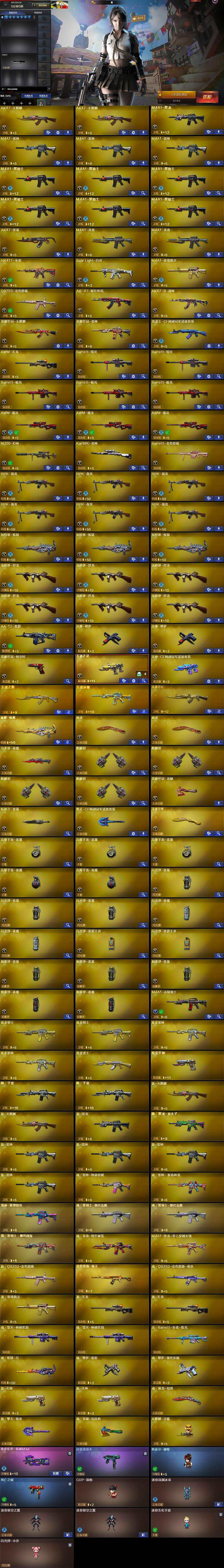 【热门武器】:QBZ03-金色蔷薇,Scar Light-白虎,HK417-朱雀,M200-幻神,死亡之眼,荣耀世冠-火麒麟,荣耀世冠-雷神,荣耀世冠-柯尔特,Kar98K-星神,M4A1-黑骑士*6,汤姆逊-烈龙*6,RPK-盘龙*6,加特林-炼狱*3,斯泰尔-蝴蝶,羊驼玩偶,沙鹰-修罗*2,荣耀世冠-龙啸