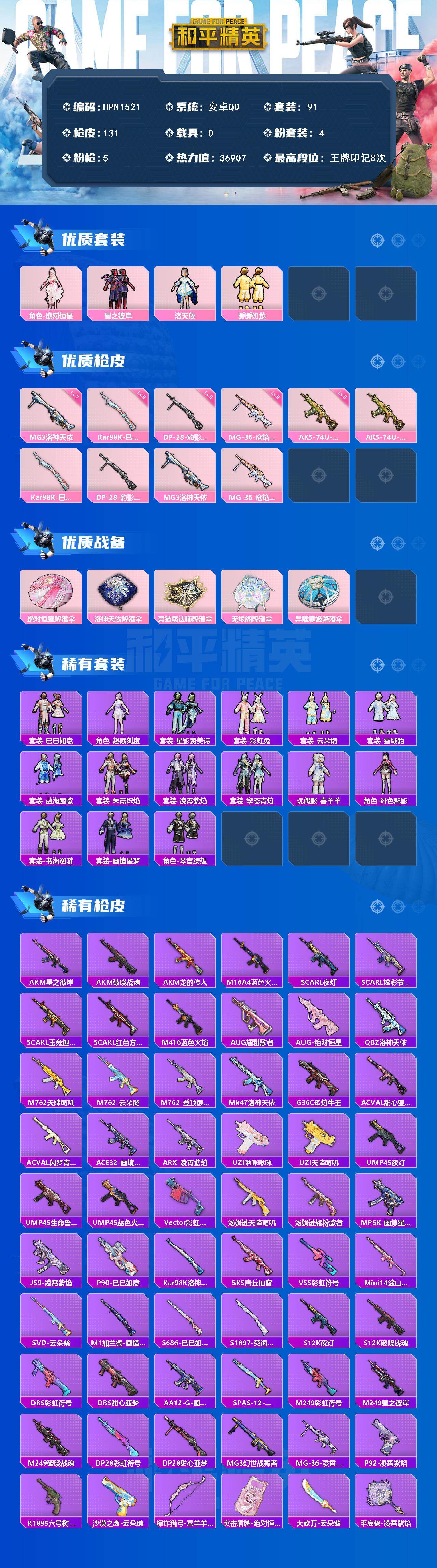 【HPN1521】91套装/枪械5/装备159/战备77/王牌印记8/热力值36907/五级AKS-74U-森灵之息/五级Kar98K-巳巳如意/五级DP-28-豹影疾电/七级MG3-洛神天依/五级MG-36-沧焰双生/角色-绝对恒星/星之彼岸/洛天依/暖暖奶龙/AKS-74U-森灵之息/Kar98K-巳巳如意/DP-28-豹影疾电/MG3-洛神天依/MG-36-沧焰双生/绝对恒星降落伞/洛神天依降落伞/灵猫魔法师降落伞/无垠阁降落伞/异瞳寒姬降落伞/炫彩糖果降落伞/巳巳如意/角色-超感刻度/套