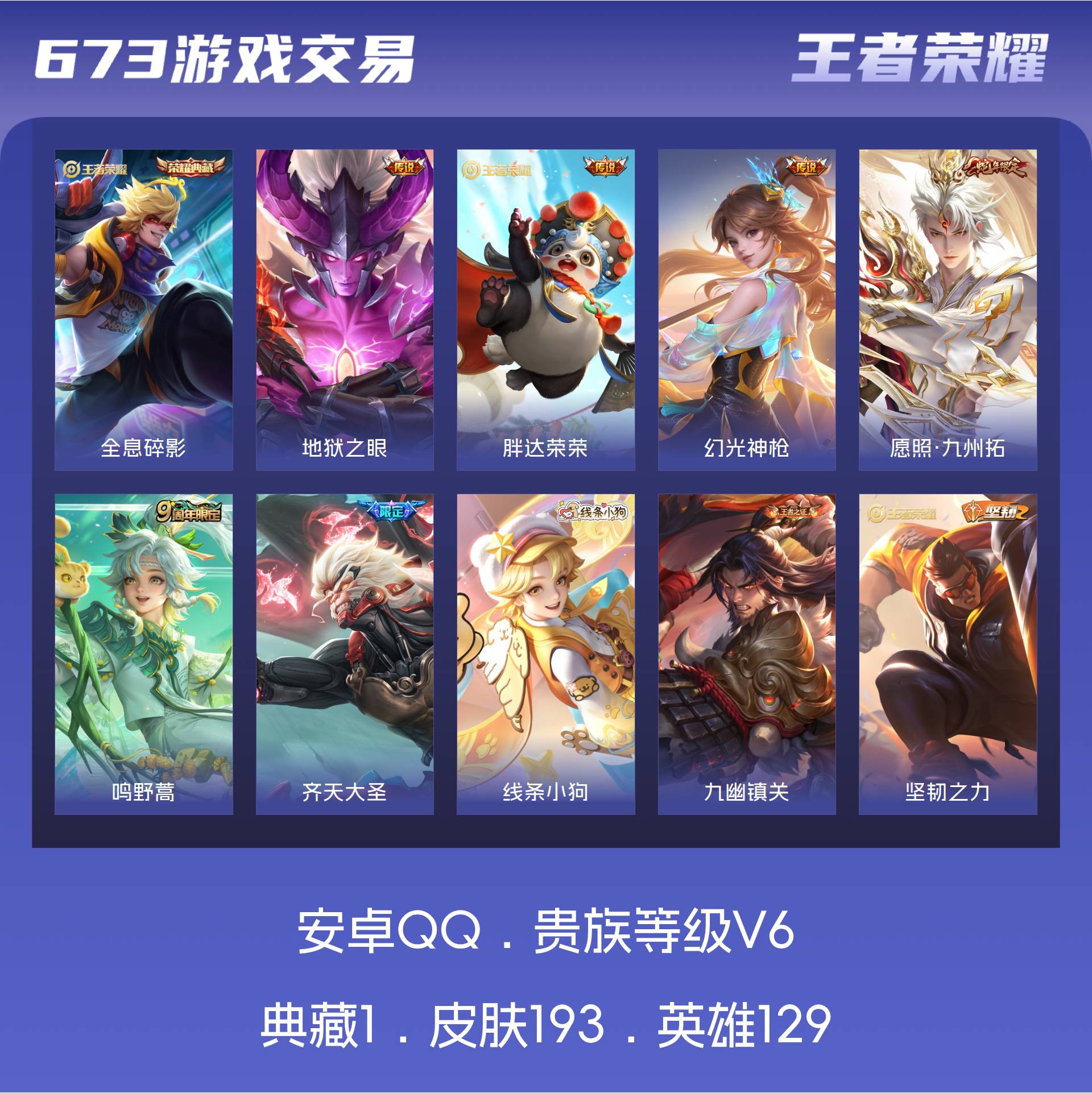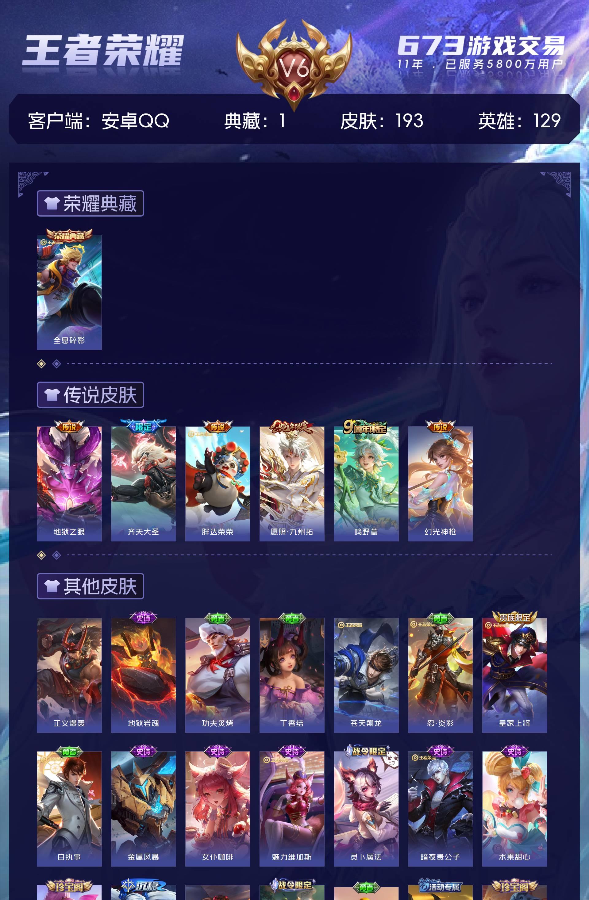 V6 皮肤193 英雄129 至尊星耀 荣耀典藏1 传说6 其他皮肤193