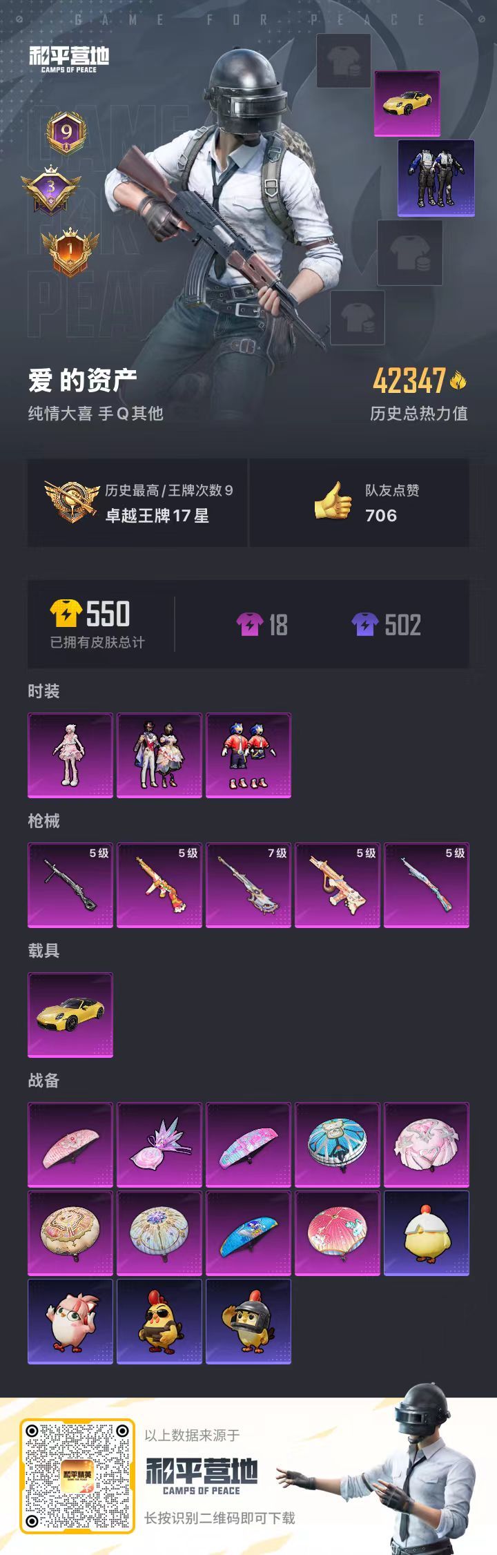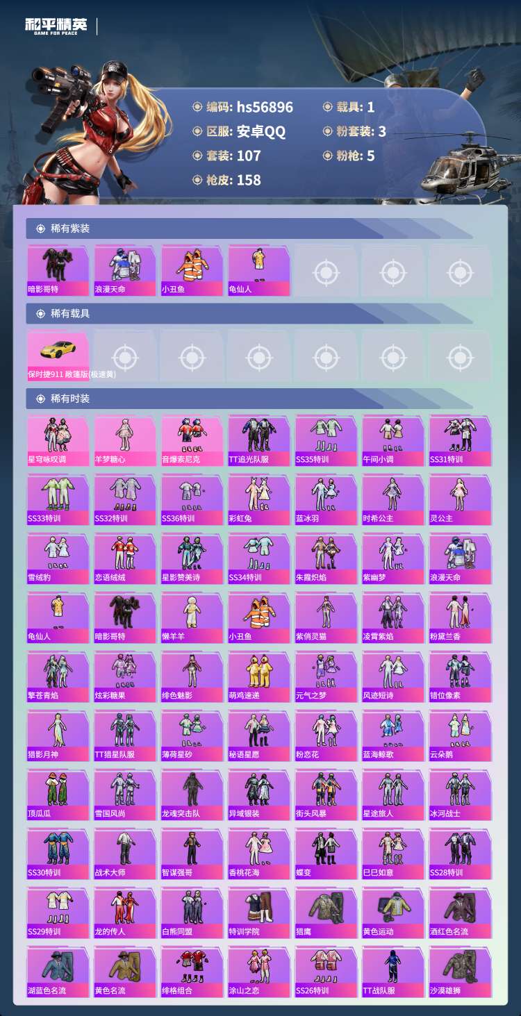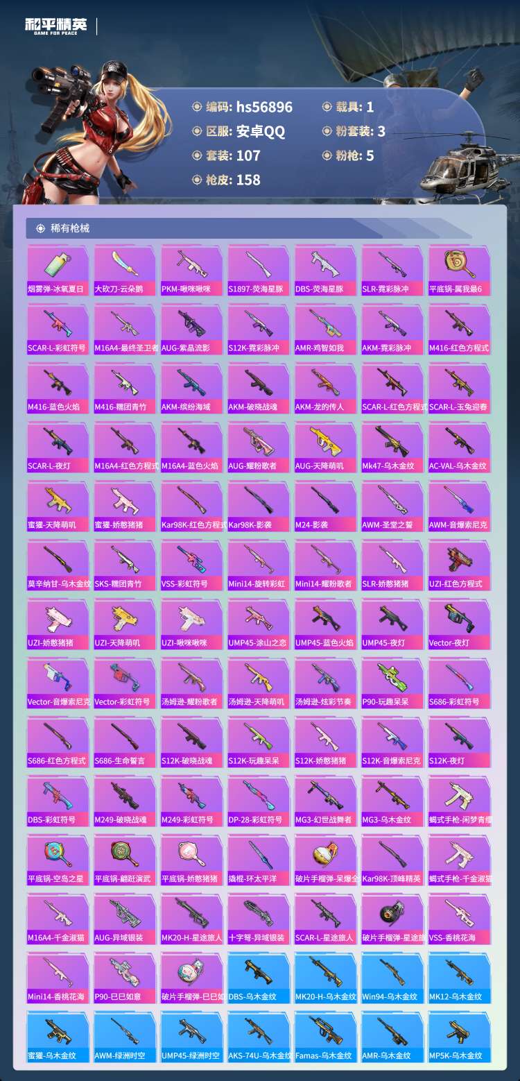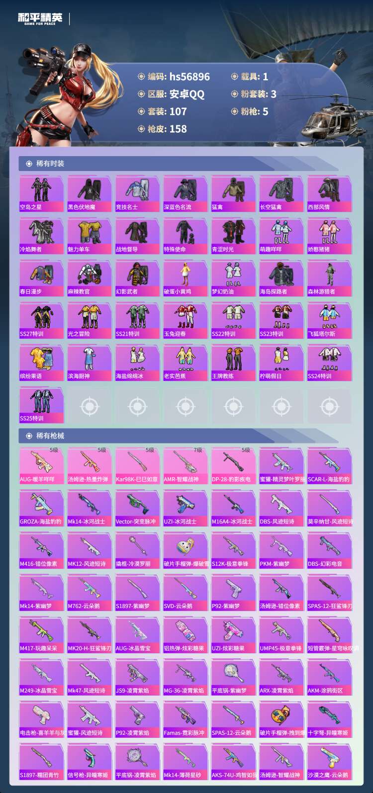 hs56896安卓手Q-9王牌印记-3粉装-5特效枪-1载具-42347热力值-107套装-158枪