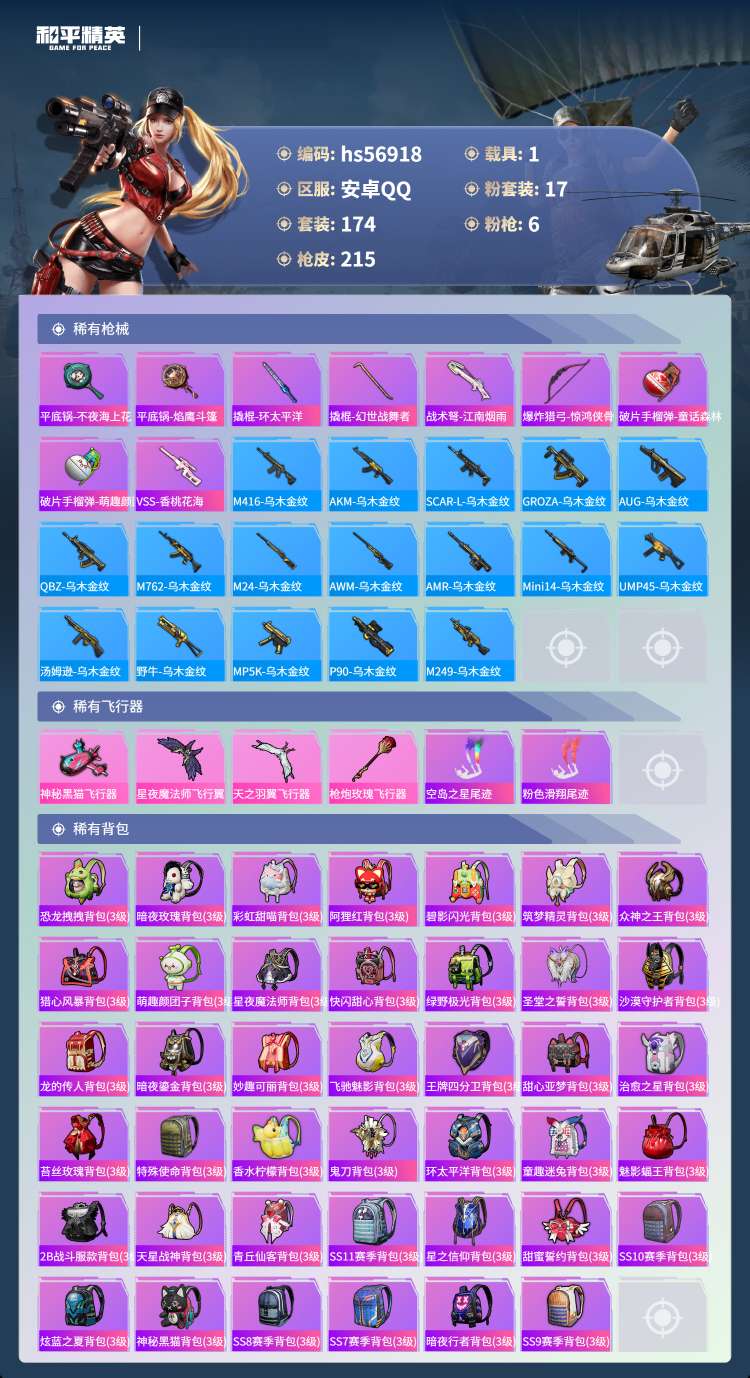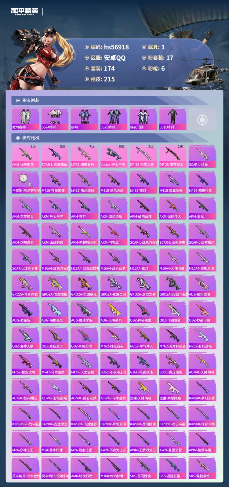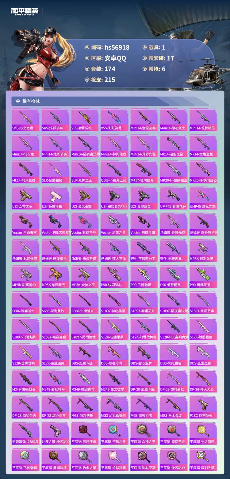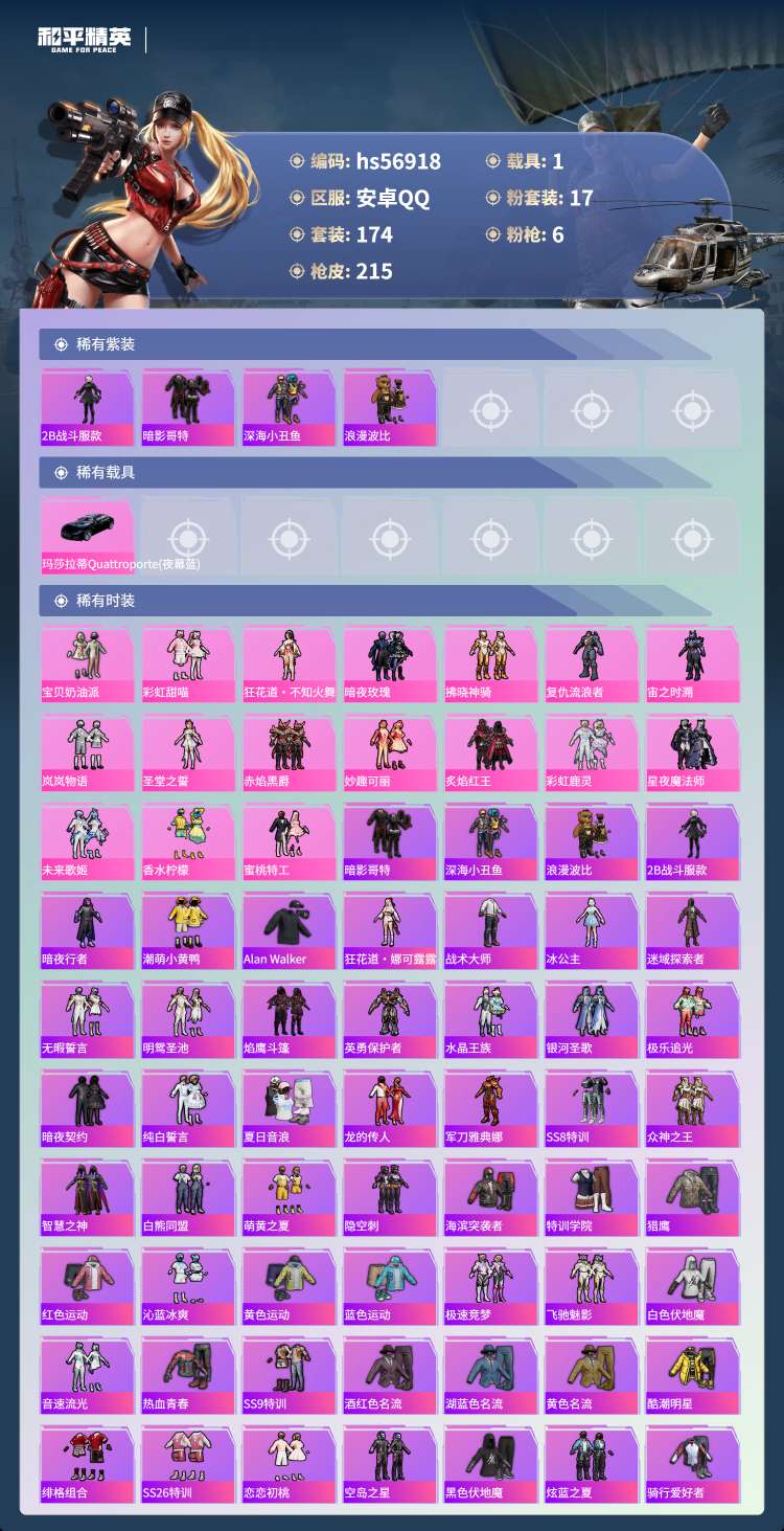 hs56918安卓手Q-2王牌印记-17粉装-6特效枪-1载具-76358热力值-174套装-215