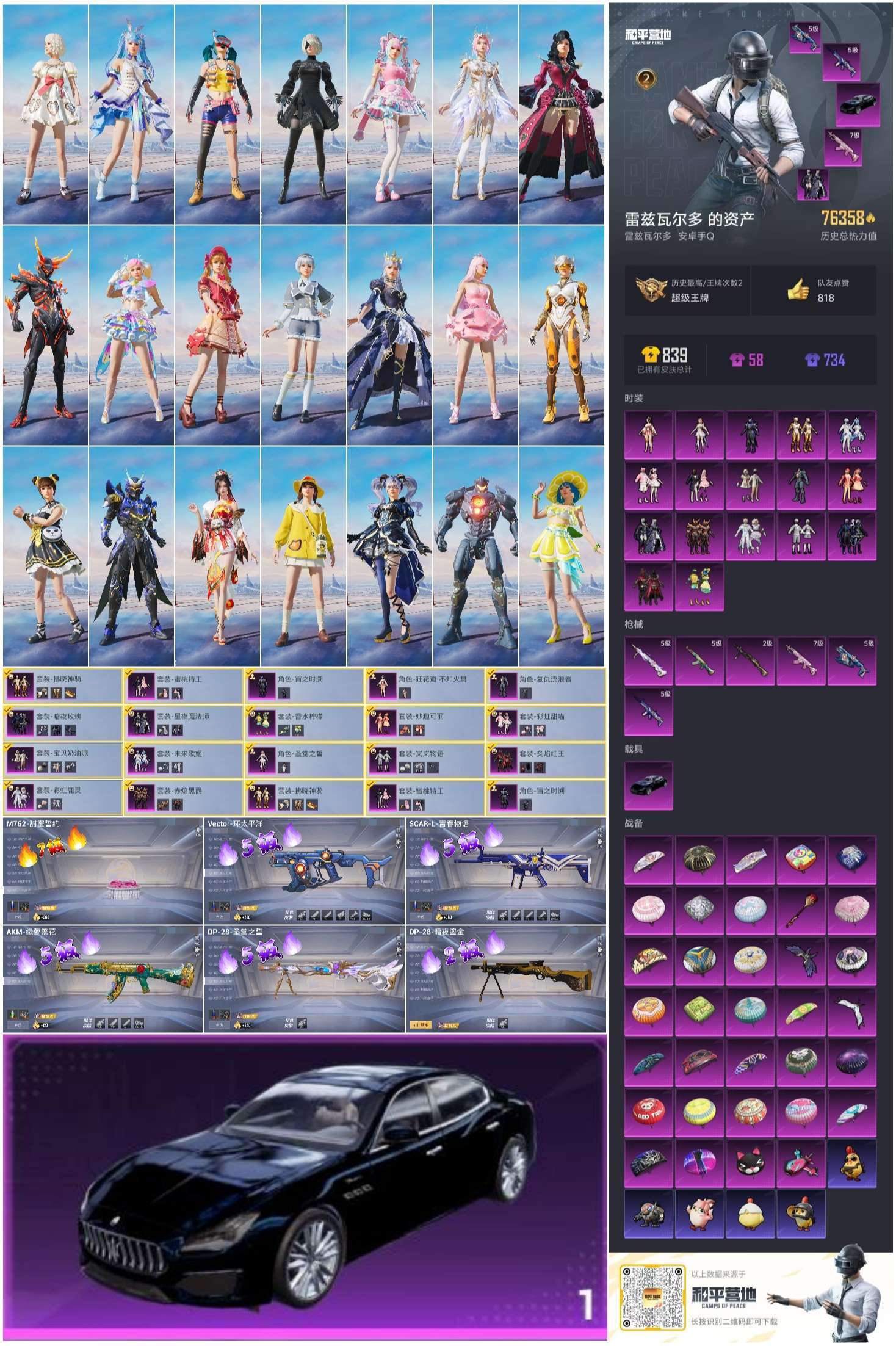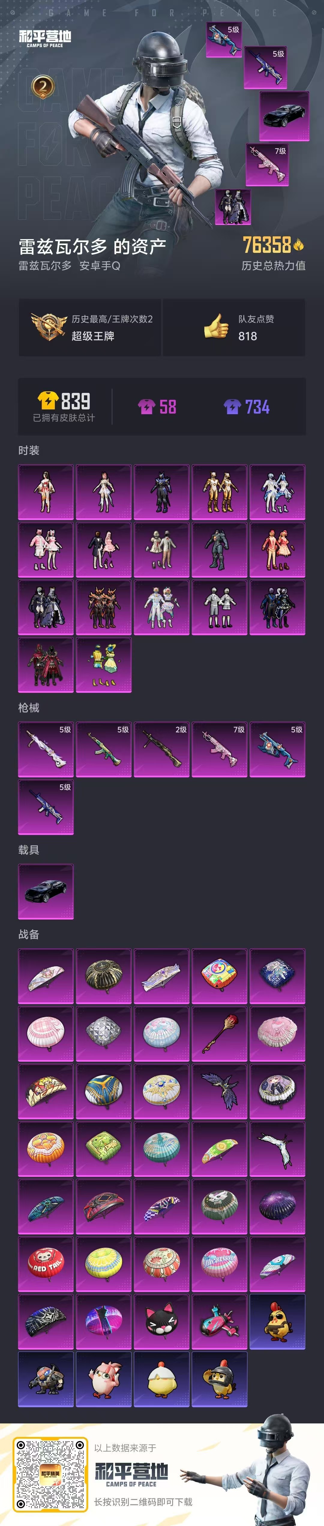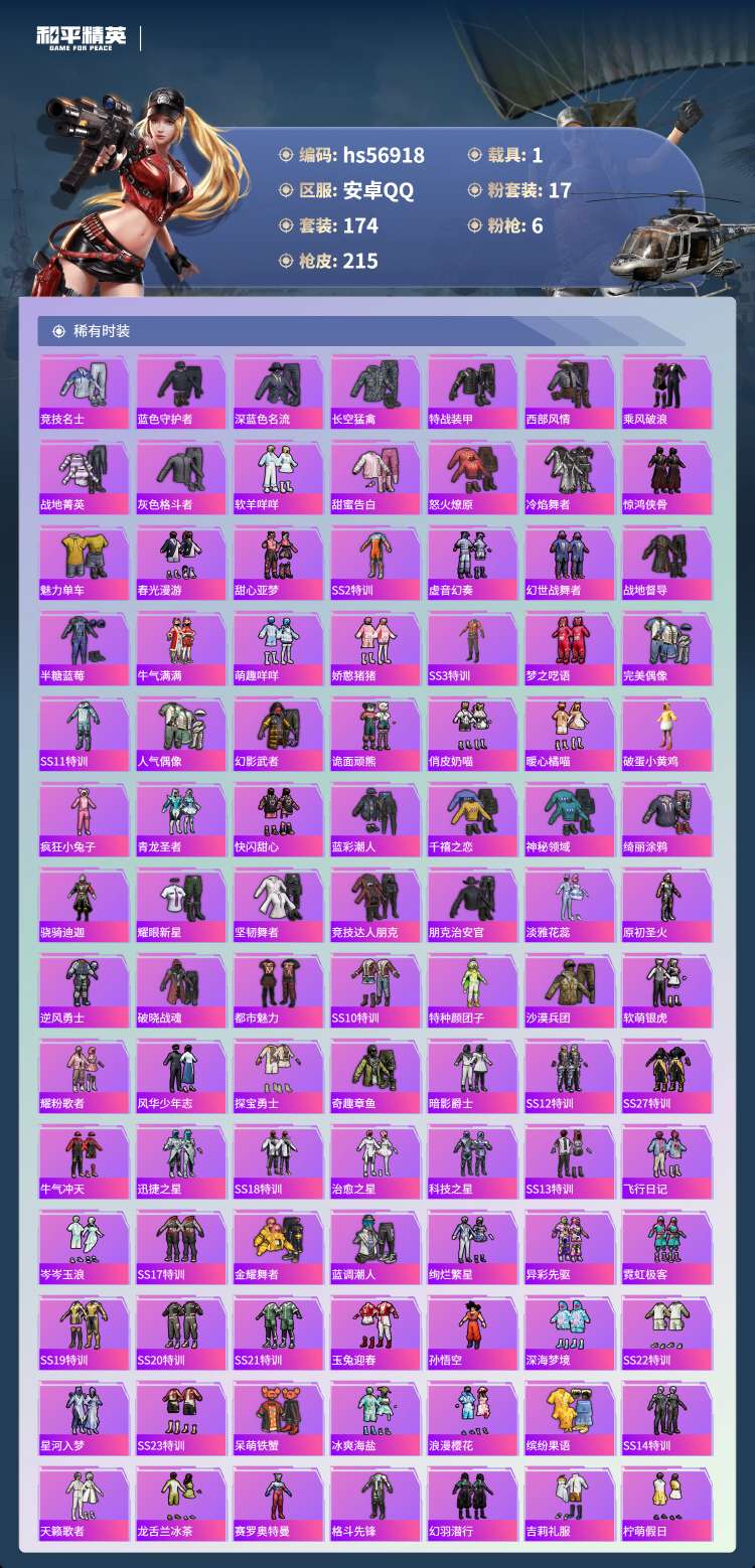 hs56918安卓手Q-2王牌印记-17粉装-6特效枪-1载具-76358热力值-174套装-215