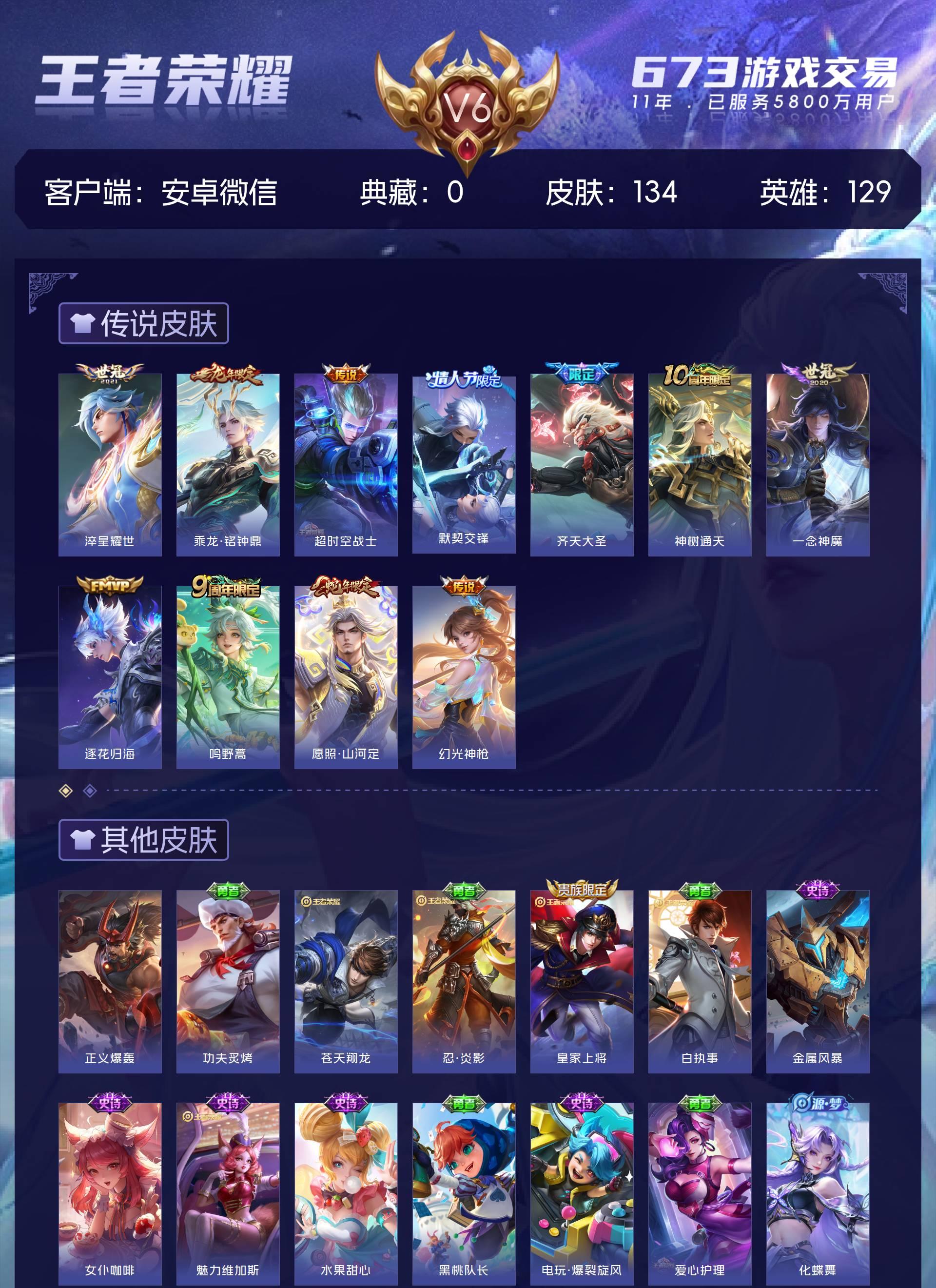 V6 皮肤134 英雄129 永恒钻石 传说11 其他皮肤130