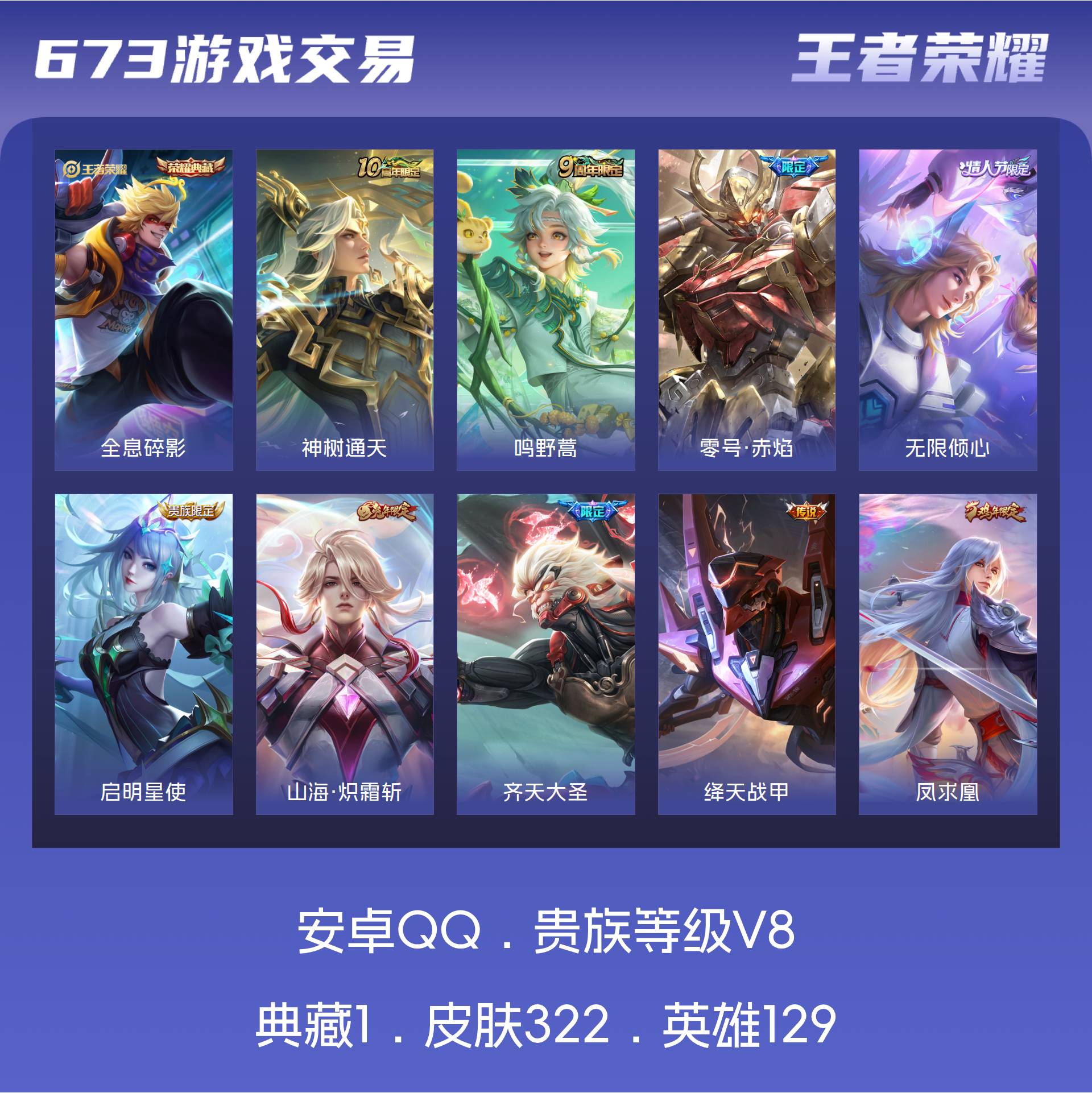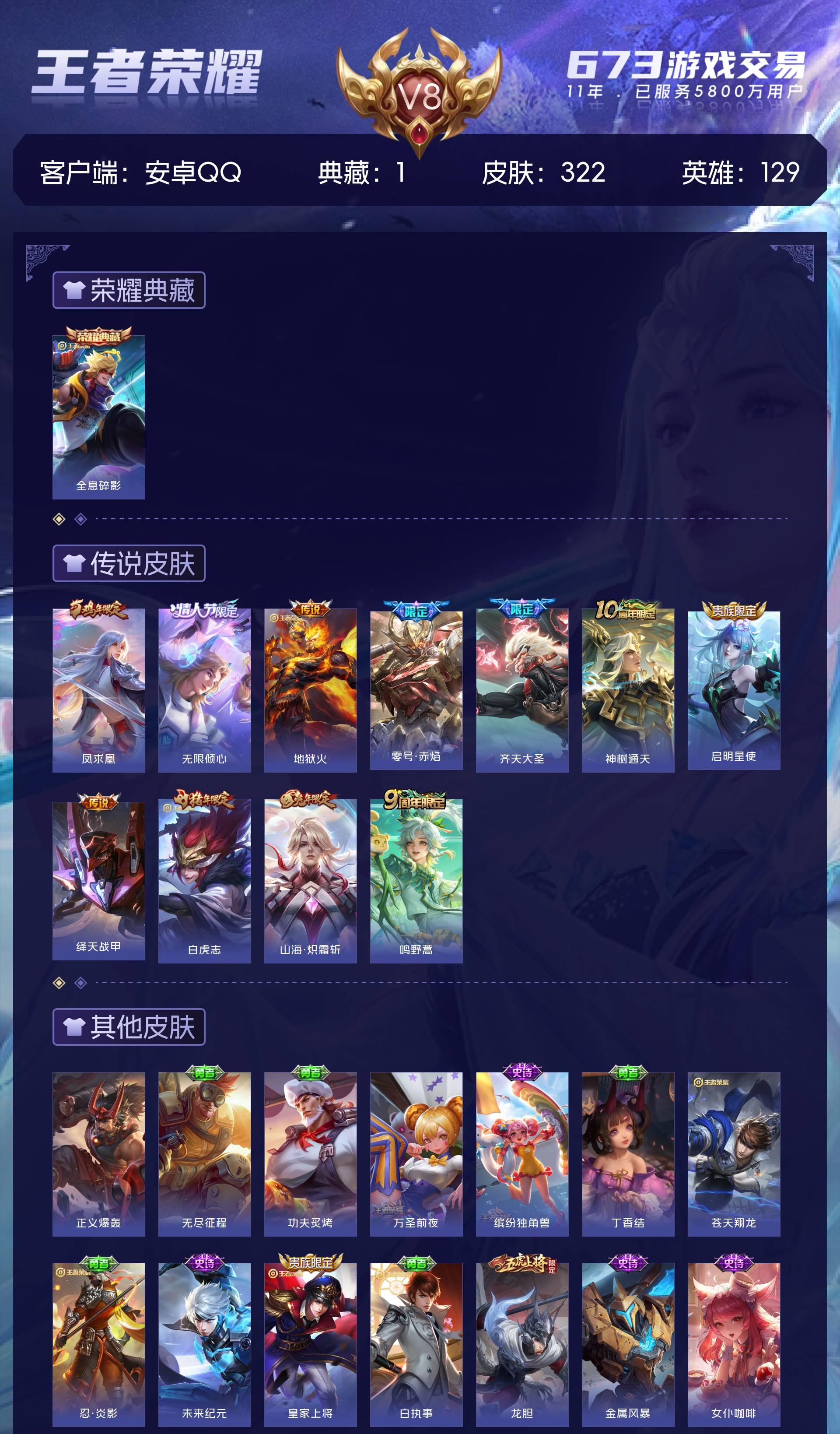 V8 皮肤322 英雄129 尊贵铂金 荣耀典藏1 星传说1 传说11 其他皮肤316
