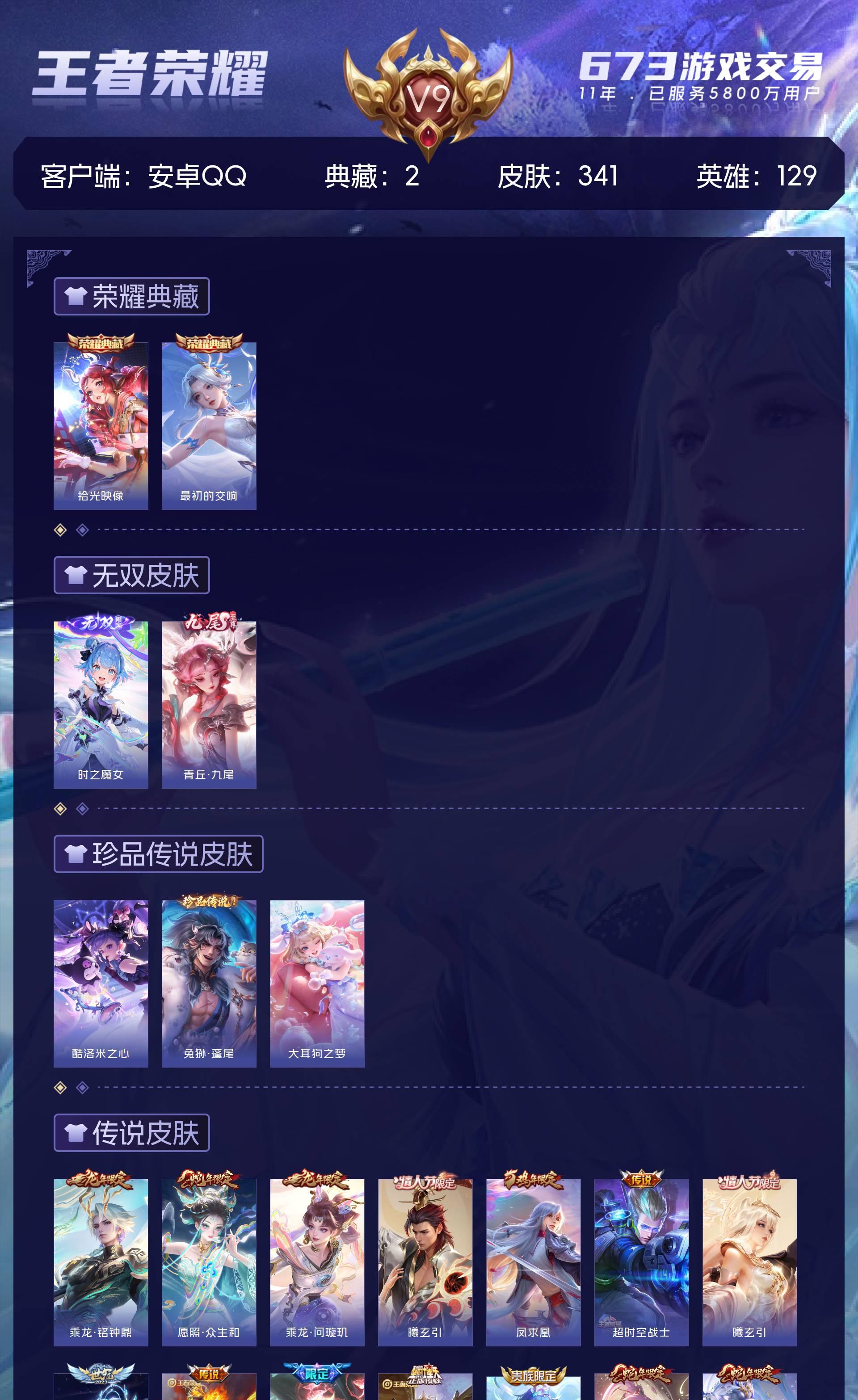 V9 皮肤341 英雄129 至尊星耀 荣耀典藏2 无双皮肤2 珍品传说3 传说29 其他皮肤312