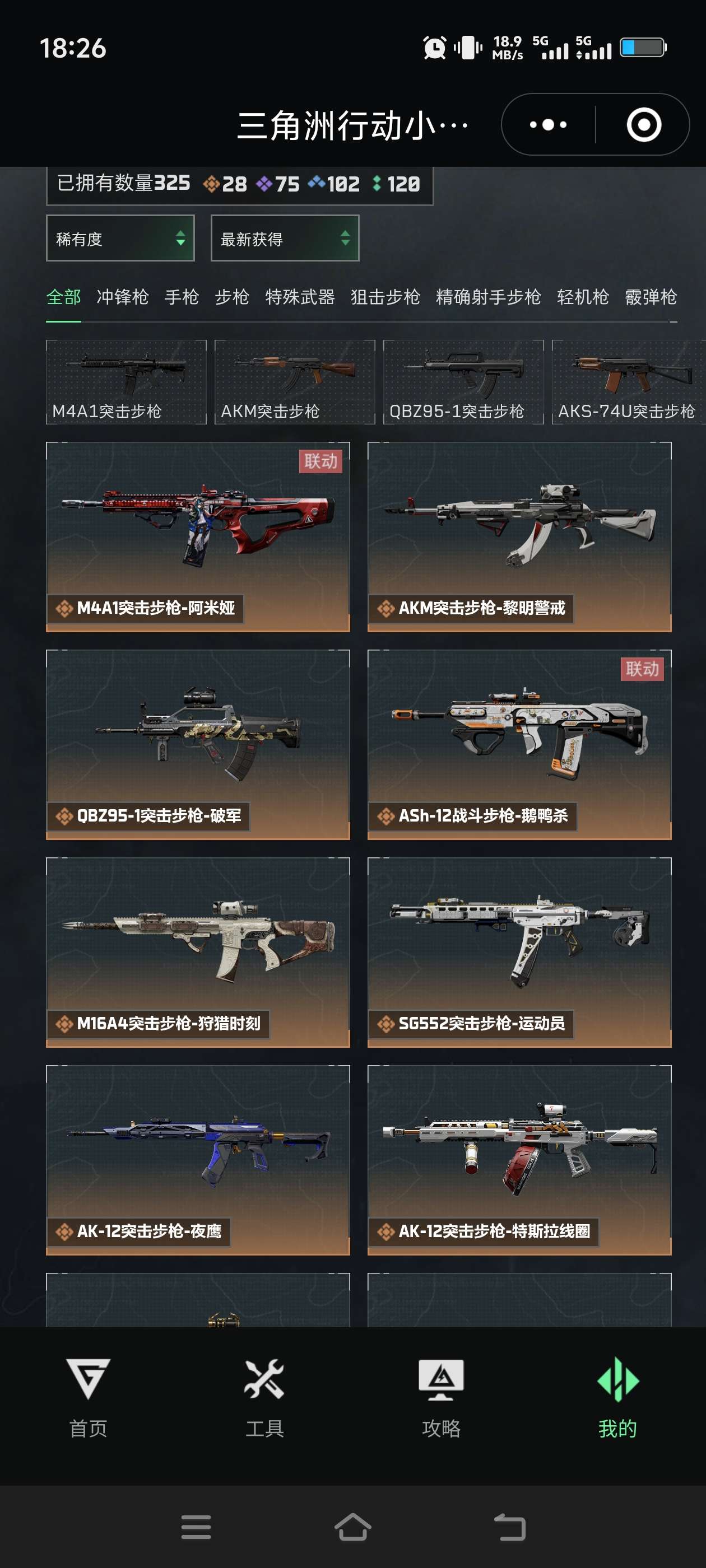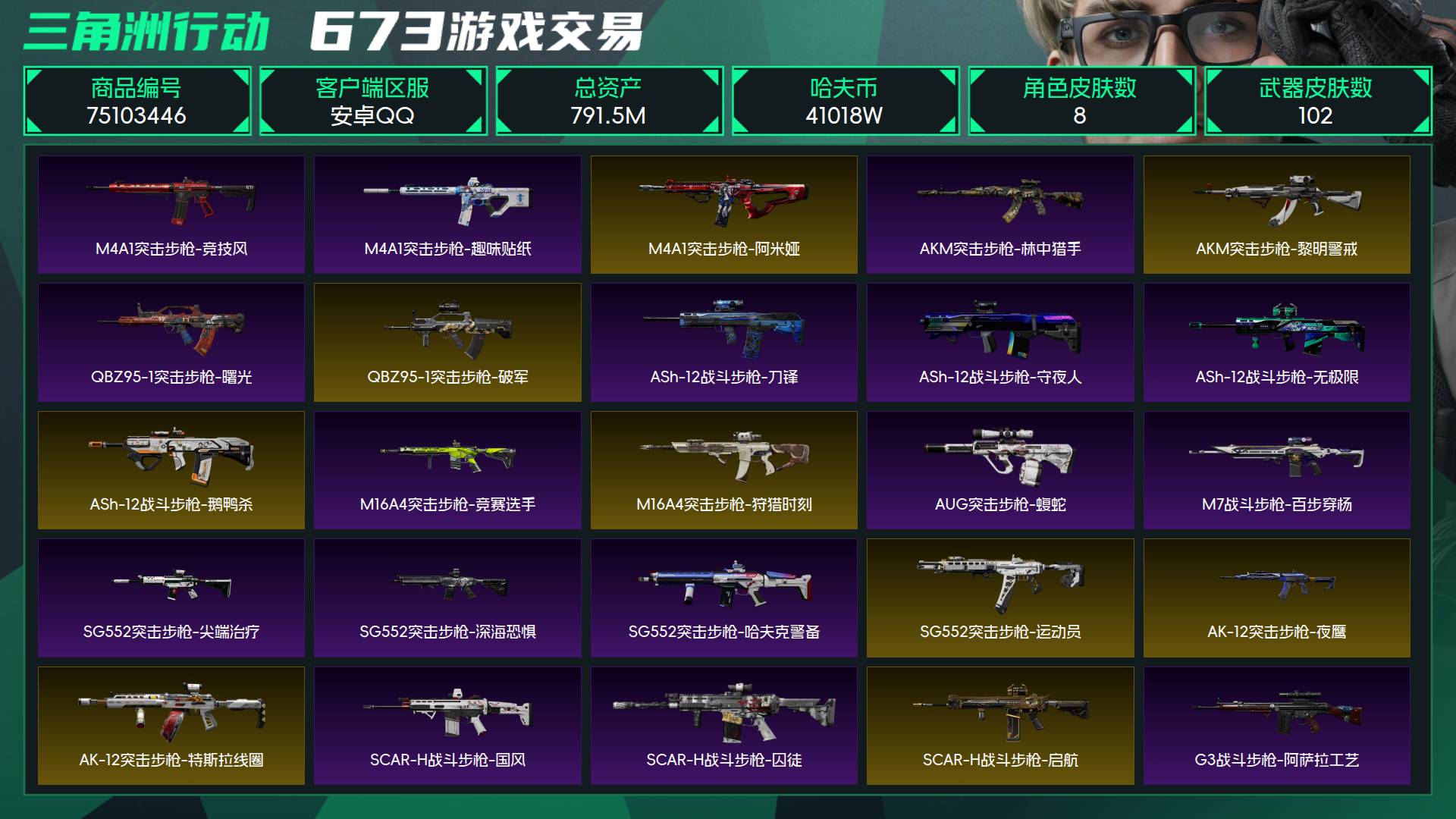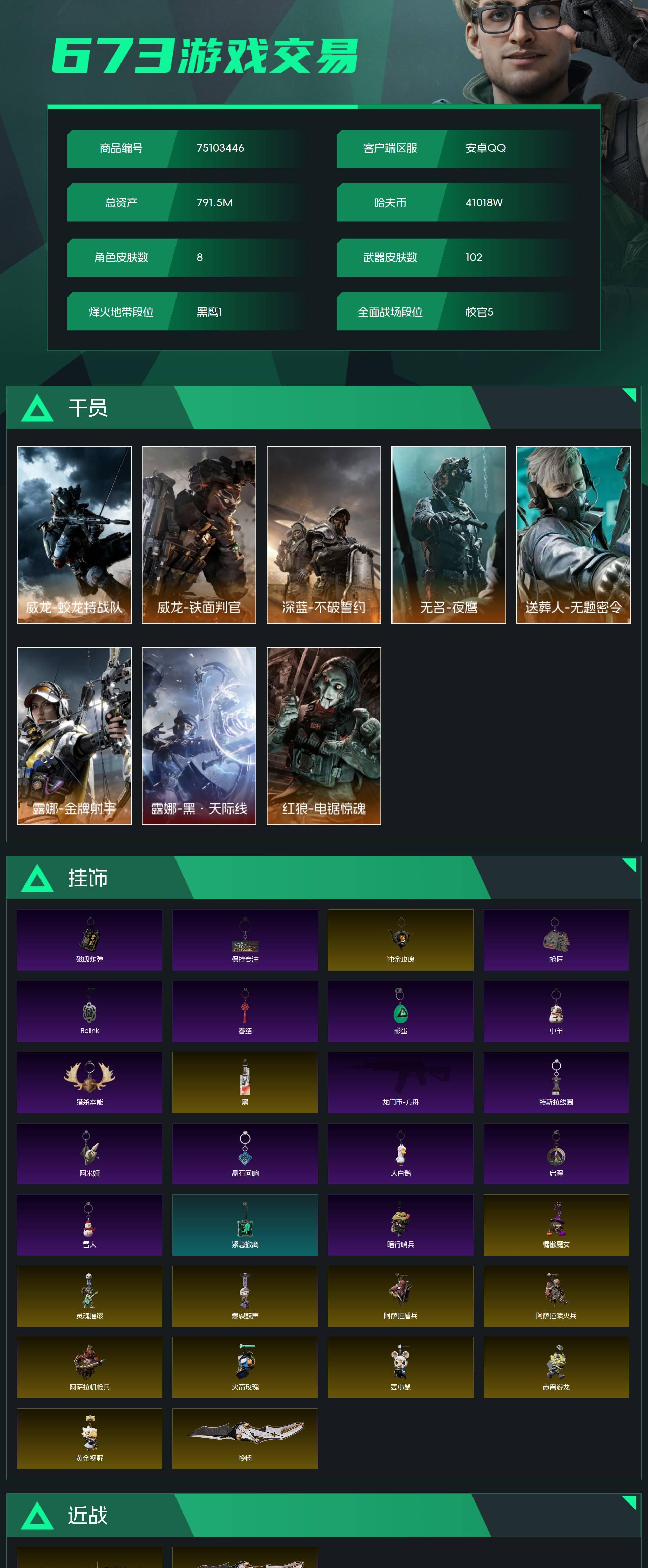 烽火段位黑鹰1 战场段位校官5 总资产791.5M 哈夫币41018W 干员8 挂饰30 近战2 枪械102 载具46
