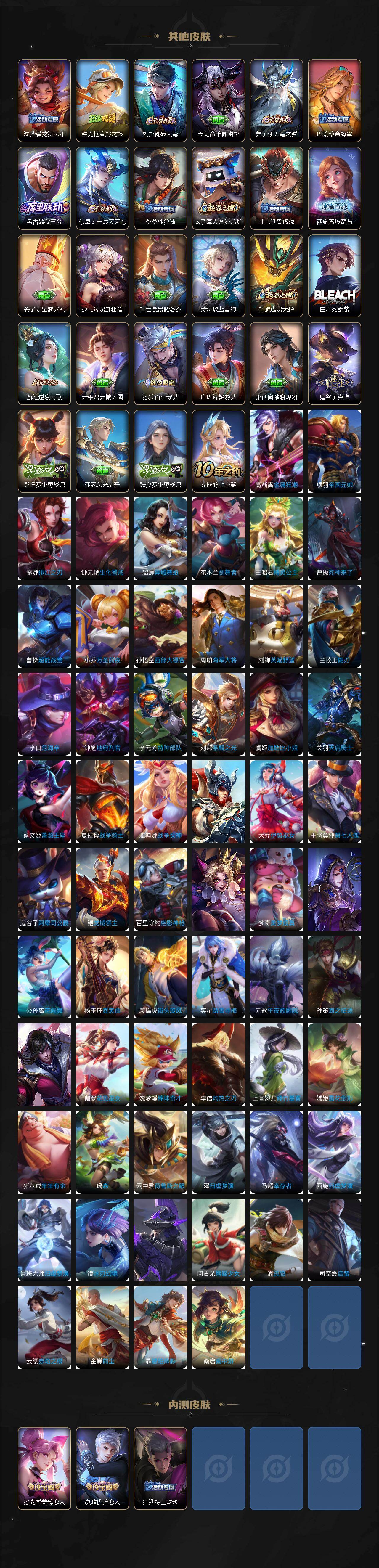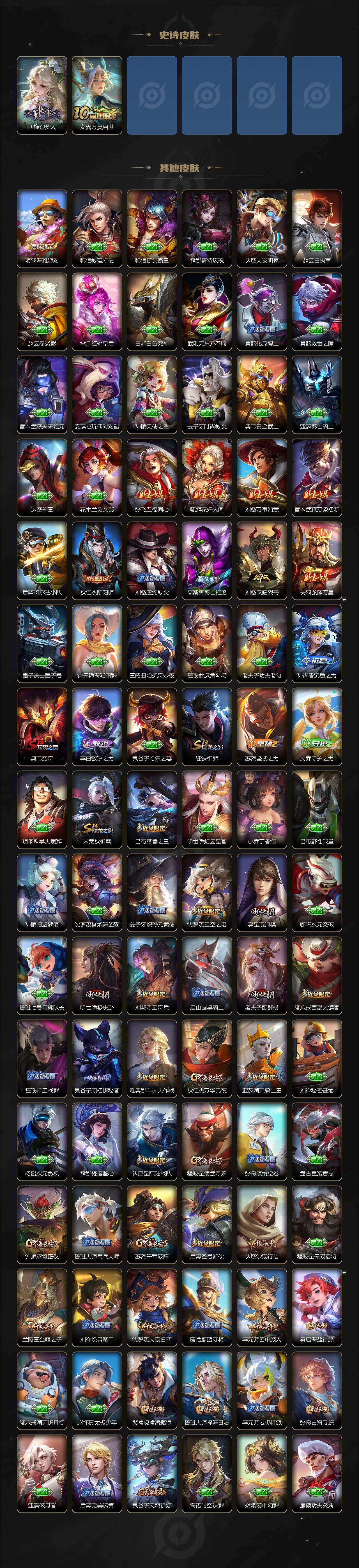 【传说皮肤】:澜愿照九州拓,桑启鸣野蒿,曜李逍遥 ,诸葛亮时雨天司,镜炽阳神光,孙悟空零号赤焰,干将莫邪久胜战神,达摩黄金狮子座,貂蝉仲夏夜之梦,宫本武藏地狱之眼