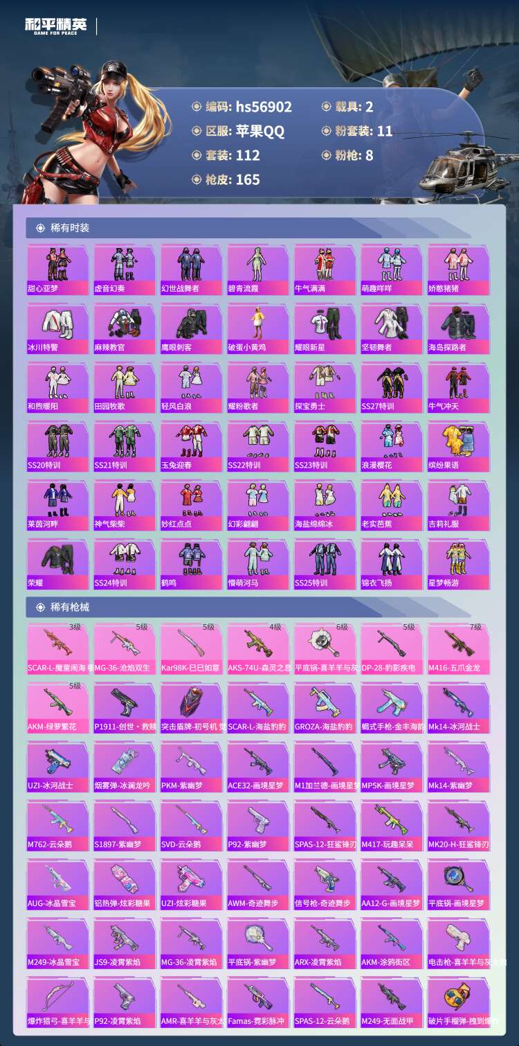 hs56902 苹果手Q-15王牌印记-11粉装-8特效枪-2载具-56469热力值-112套装-1