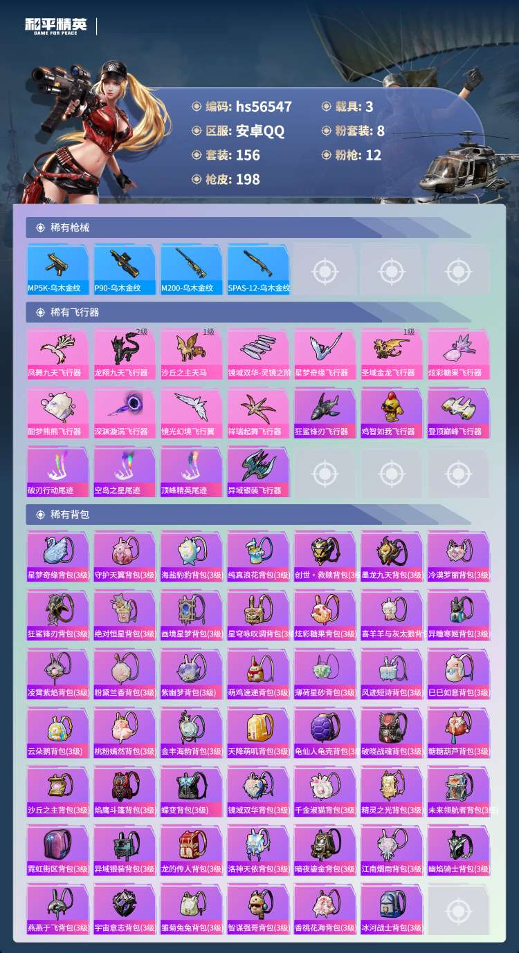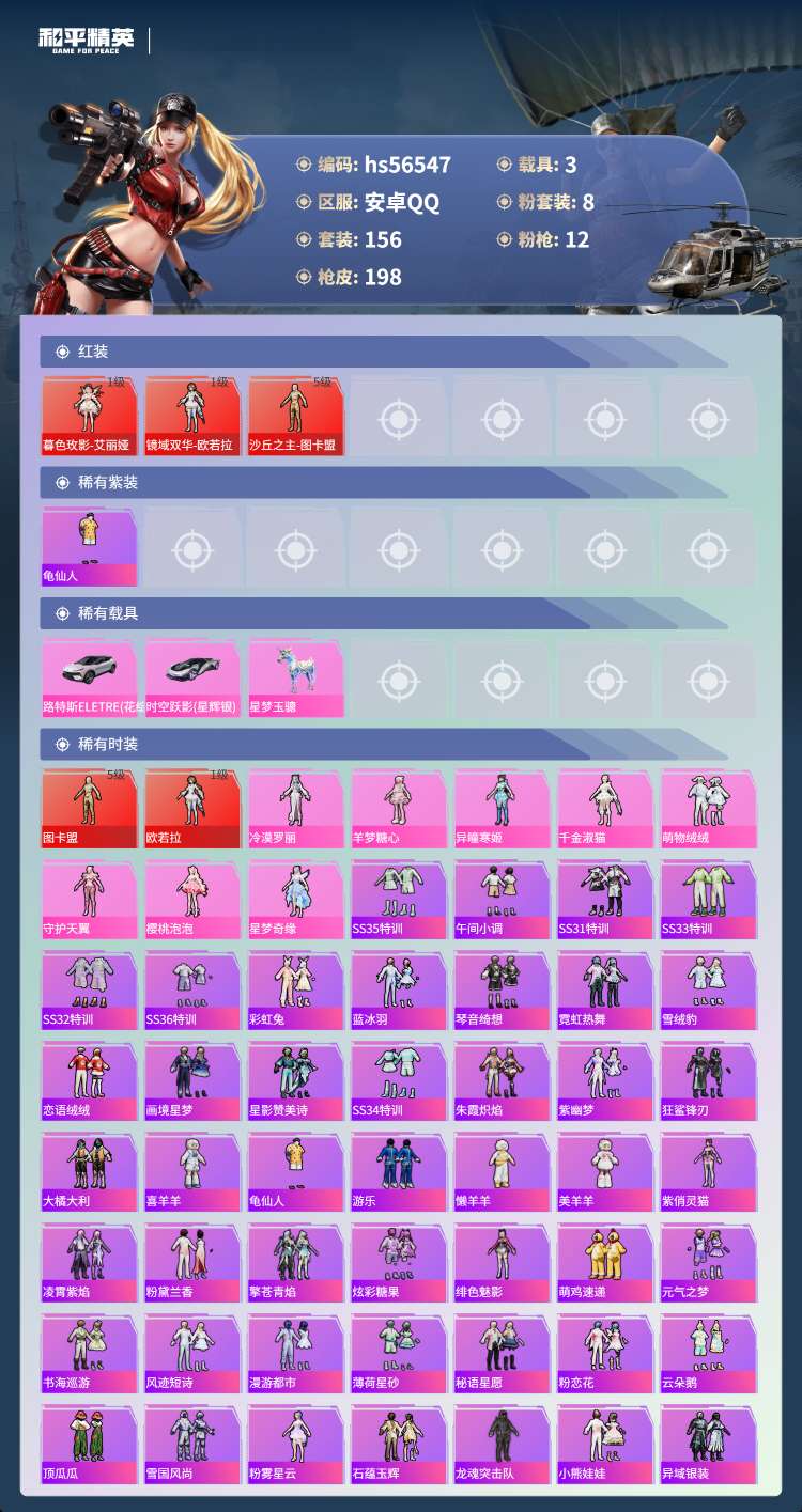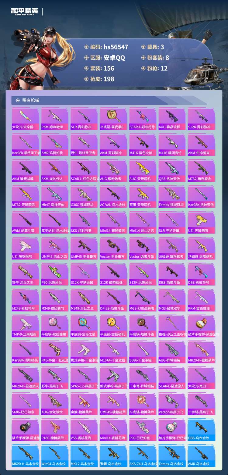 hs56547安卓手Q-12王牌印记-3红装-8粉装-12特效枪-3载具-82547热力值-156套