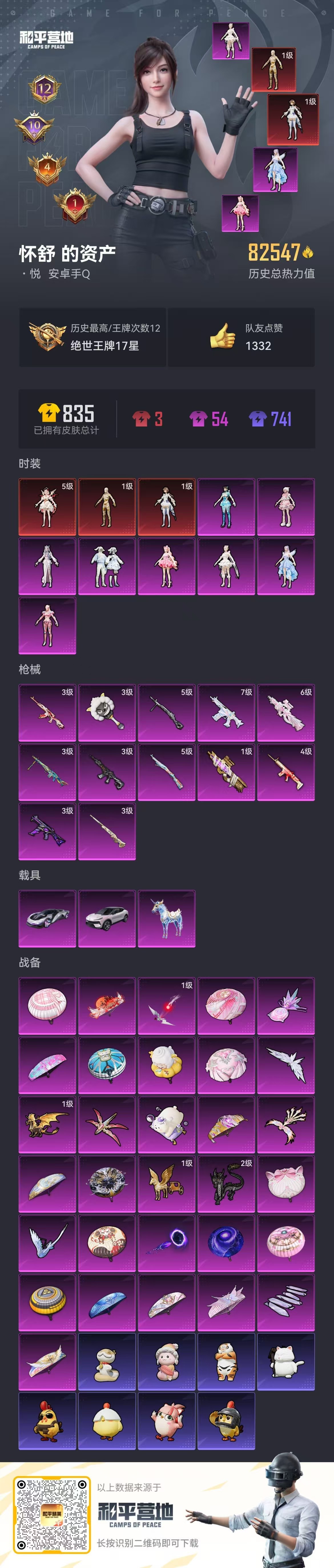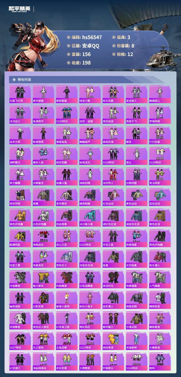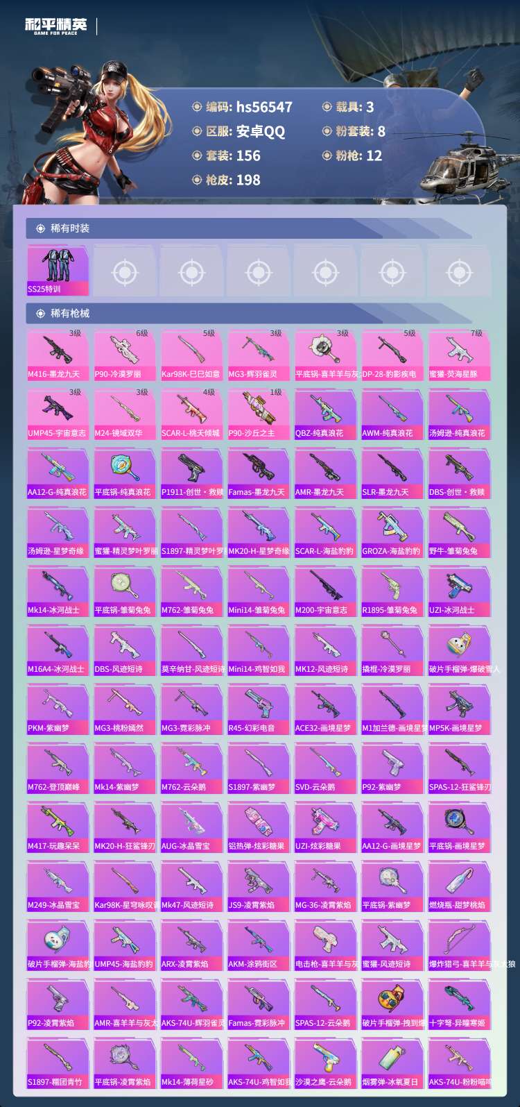 hs56547安卓手Q-12王牌印记-3红装-8粉装-12特效枪-3载具-82547热力值-156套