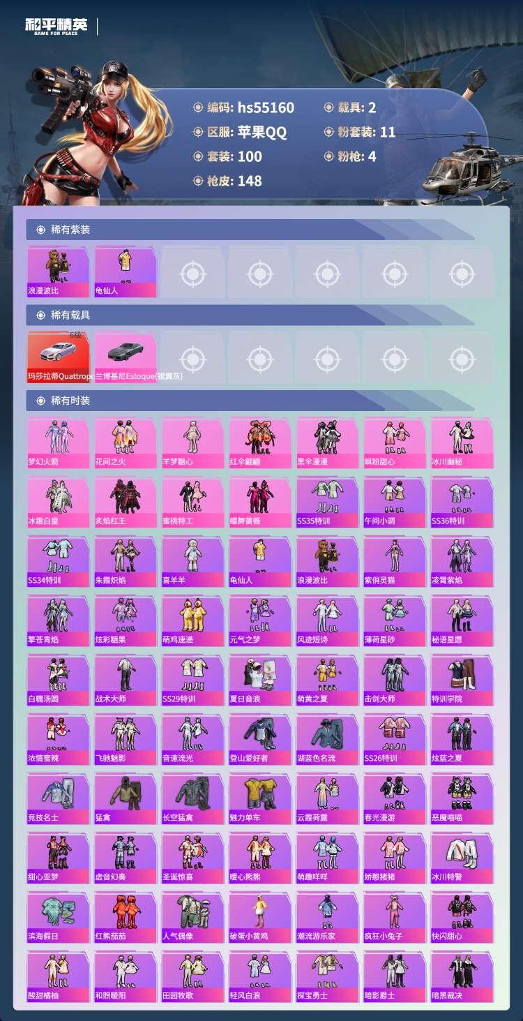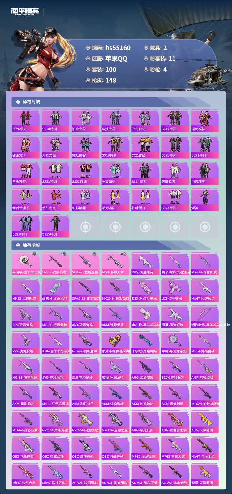 hs55160苹果手Q-10王牌印记-11粉装-4特效枪-2载具-53855热力值-100套装-14