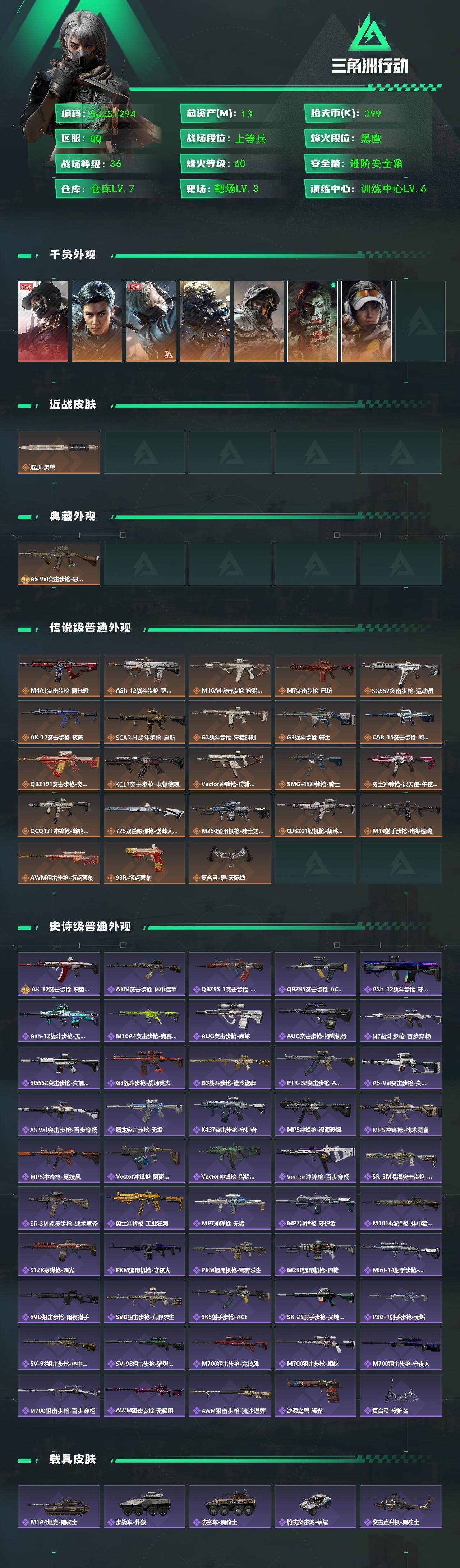 总资产(M):13M/哈夫币(K):399K/哈夫币(K):399K/传说枪皮数:24/全面战场等级