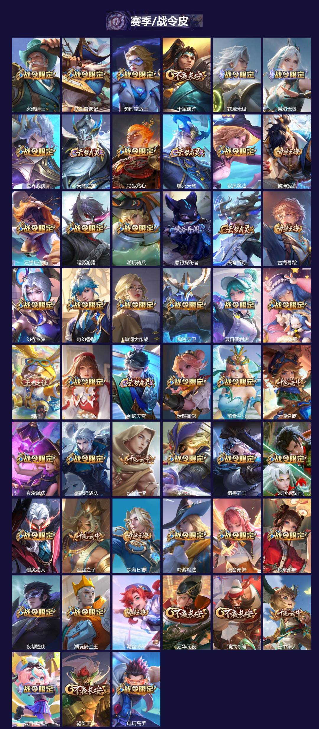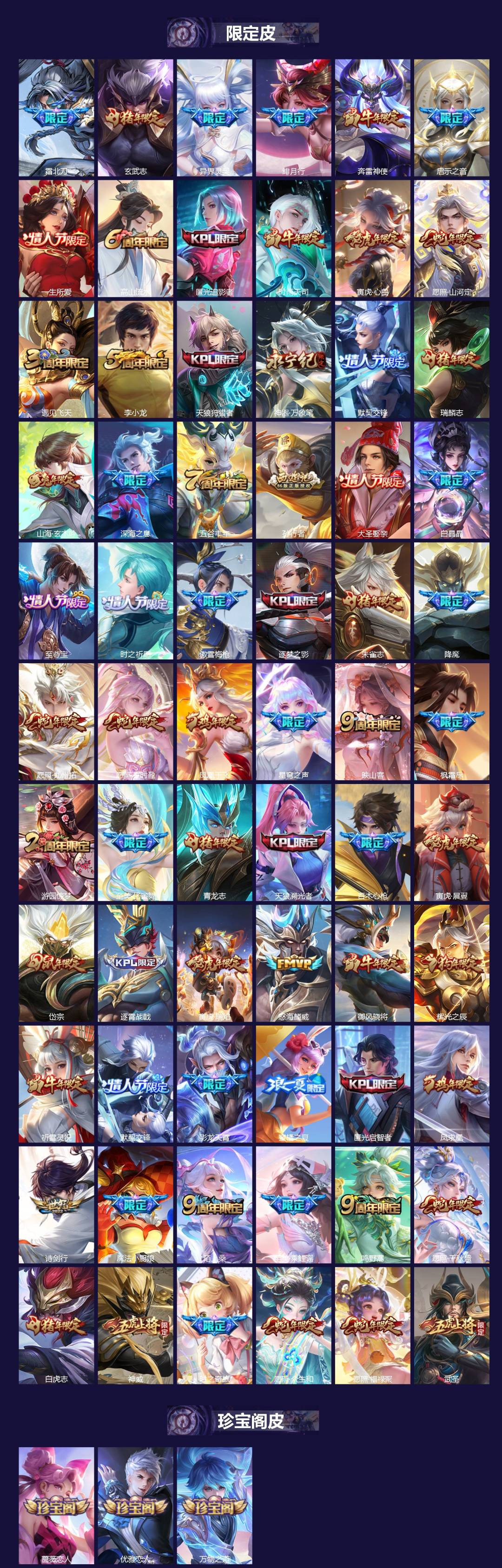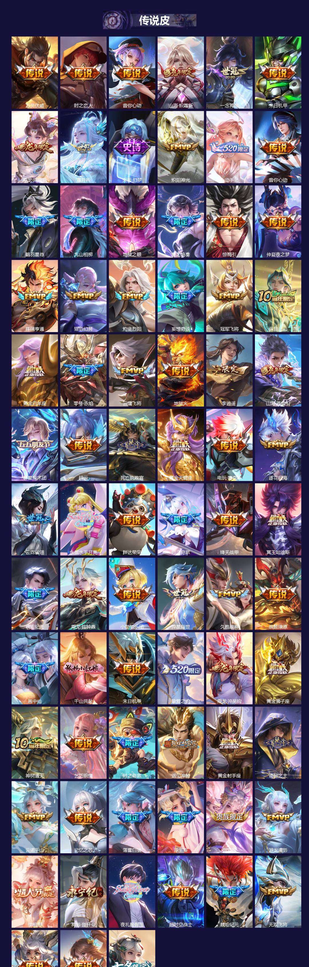 【英雄全皮】:朵莉亚全皮,李白全皮,露娜全皮,马超全皮,李信全皮,不知火舞全皮,百里玄策全皮,少司缘全皮,王昭君全皮,司空震全皮,孙策全皮,狄仁杰全皮,镜全皮,云缨全皮,西施全皮,阿古朵全皮,蒙恬全皮,云中君全皮,橘右京全皮,澜全皮,元歌全皮,敖隐全皮,空空儿全皮,孙权全皮,蚩奼全皮,百里守约全皮,苍全皮,达摩全皮,海诺全皮,鬼谷子全皮,刘禅全皮,戈娅全皮,鲁班大师全皮,莱西奥全