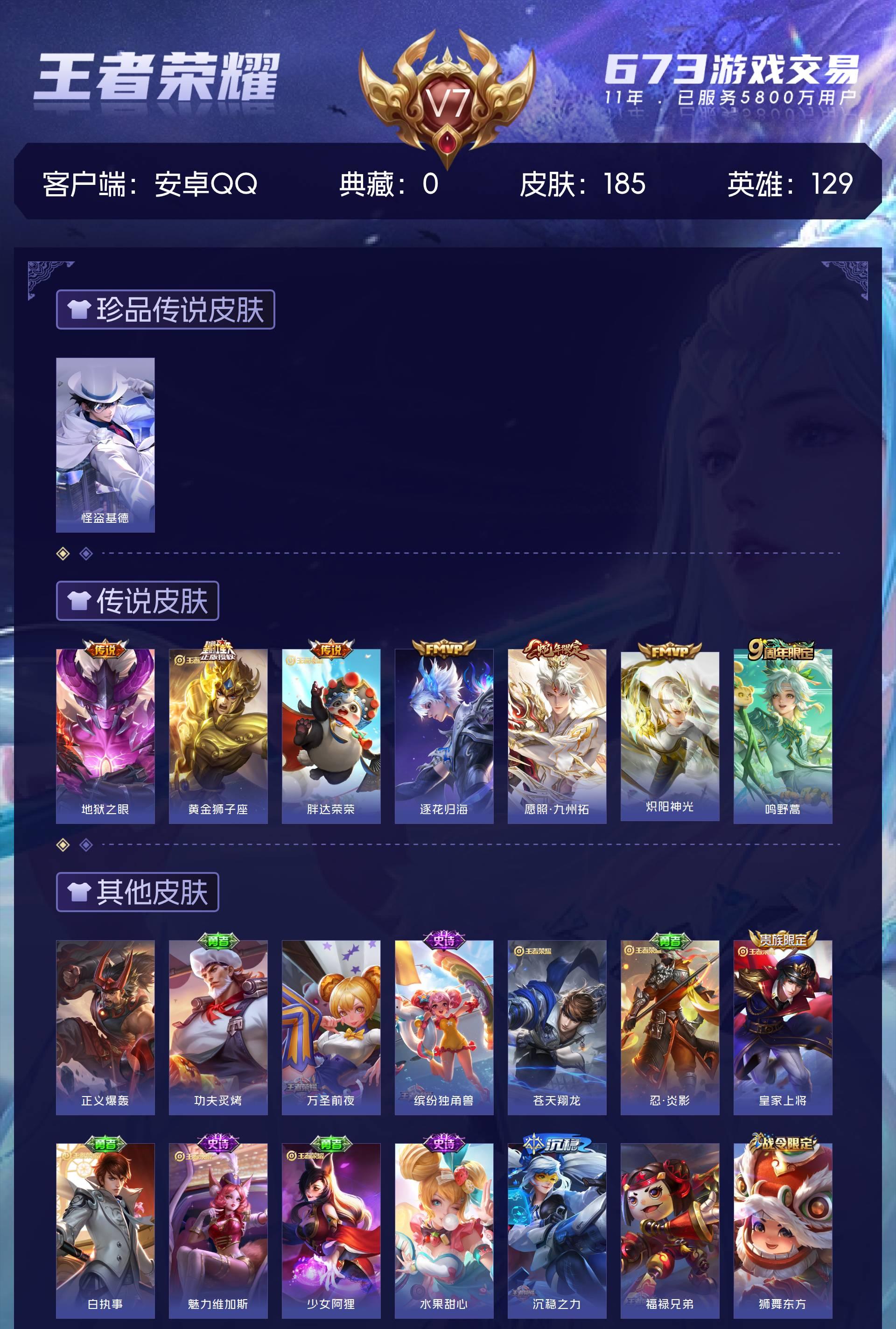 V7 皮肤185 英雄129 无双王者 珍品传说1 星传说1 传说7 其他皮肤183