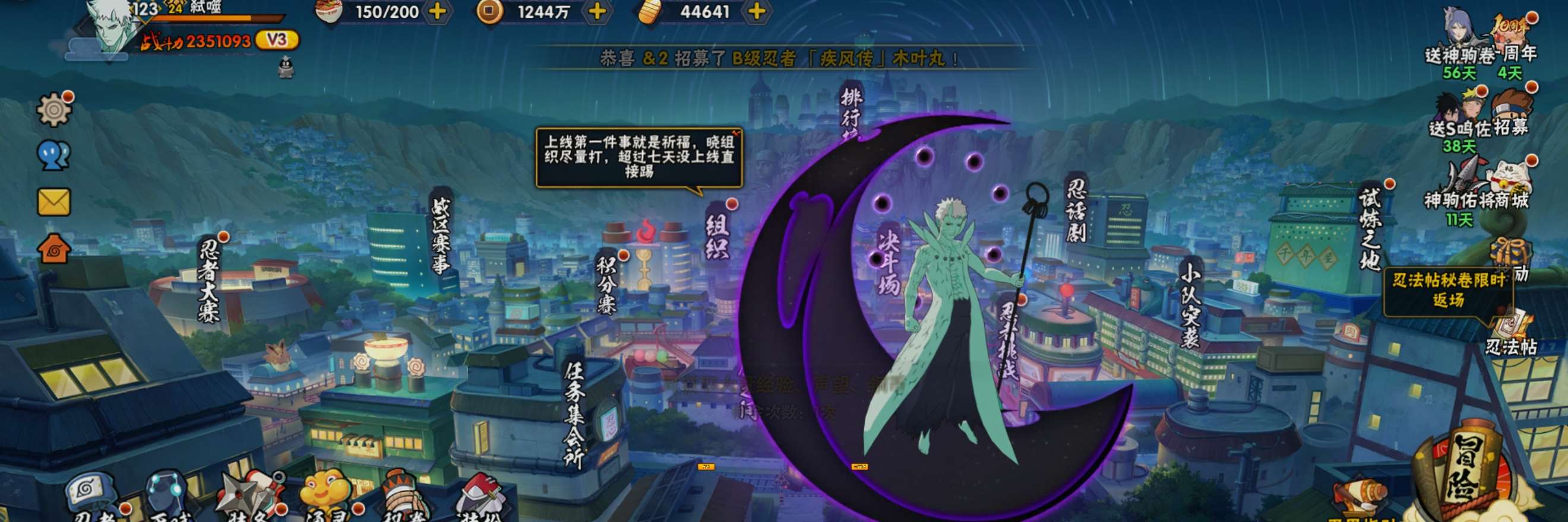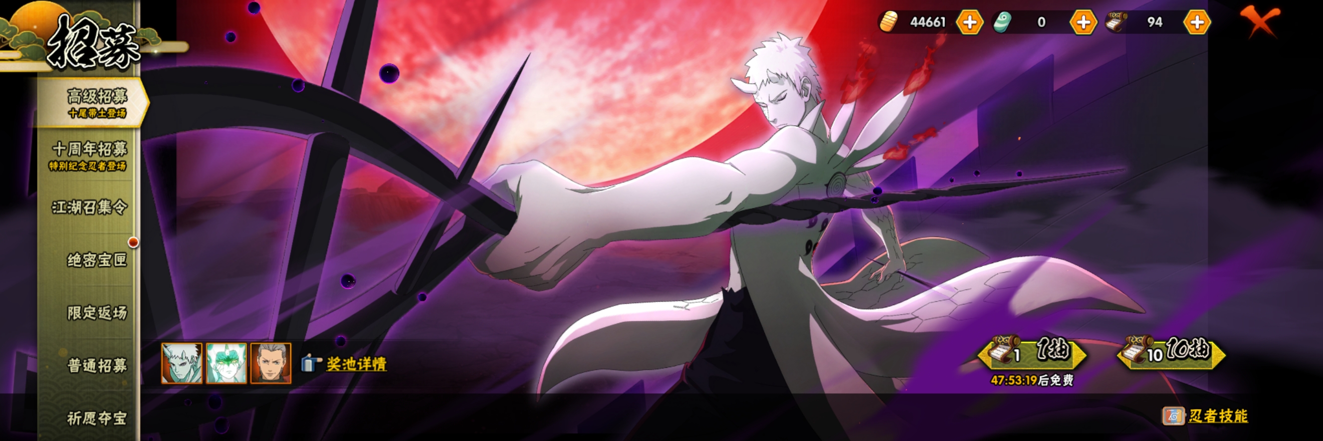 高贵自抽号4.9w金币+104抽高招,十尾带土,决斗场手册也还没做,永久25元忍法帖通灵一尾v3