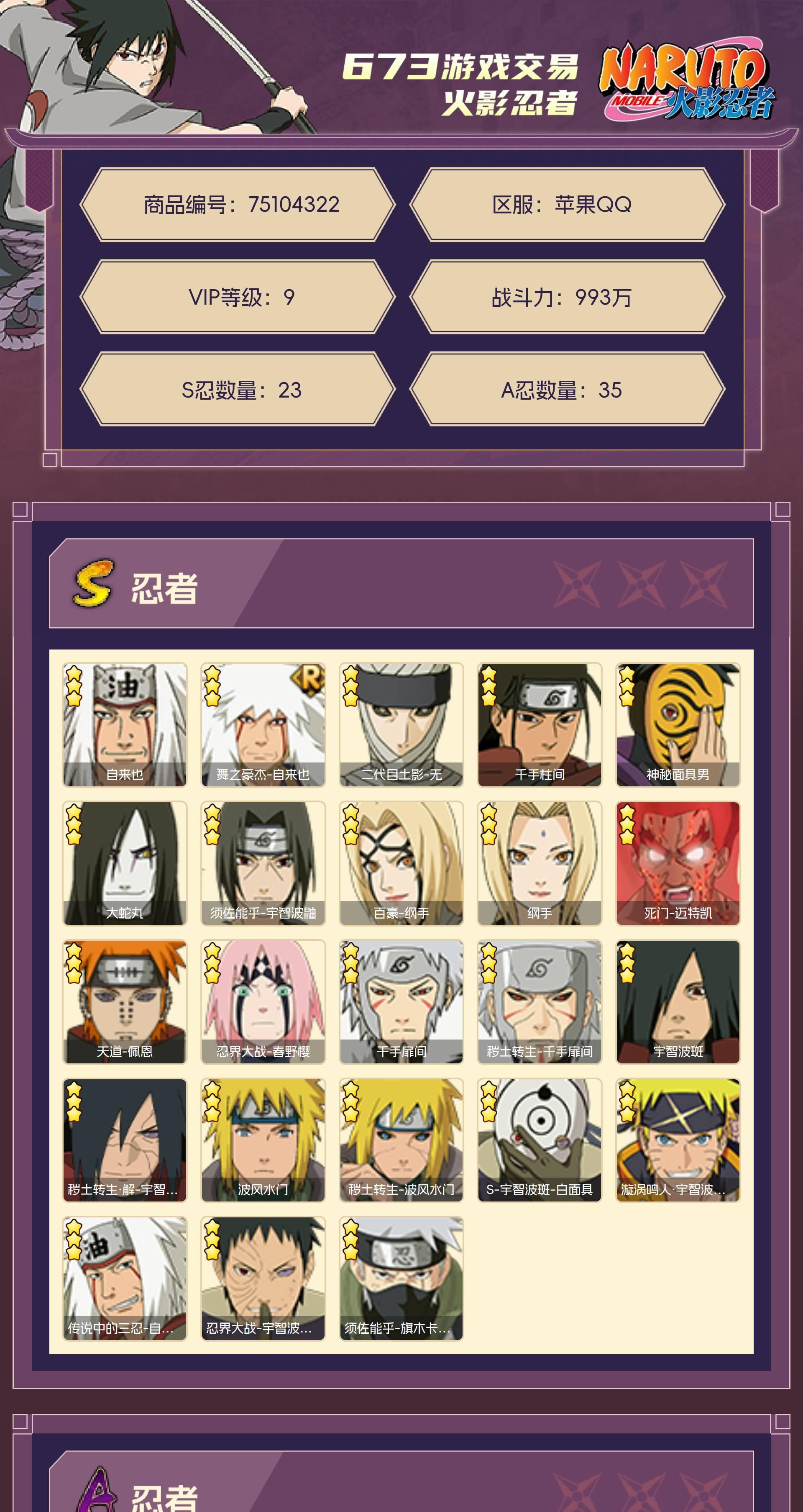 角色等级148 金币1000 战斗力993万 S忍23 A忍35 9 段位超影