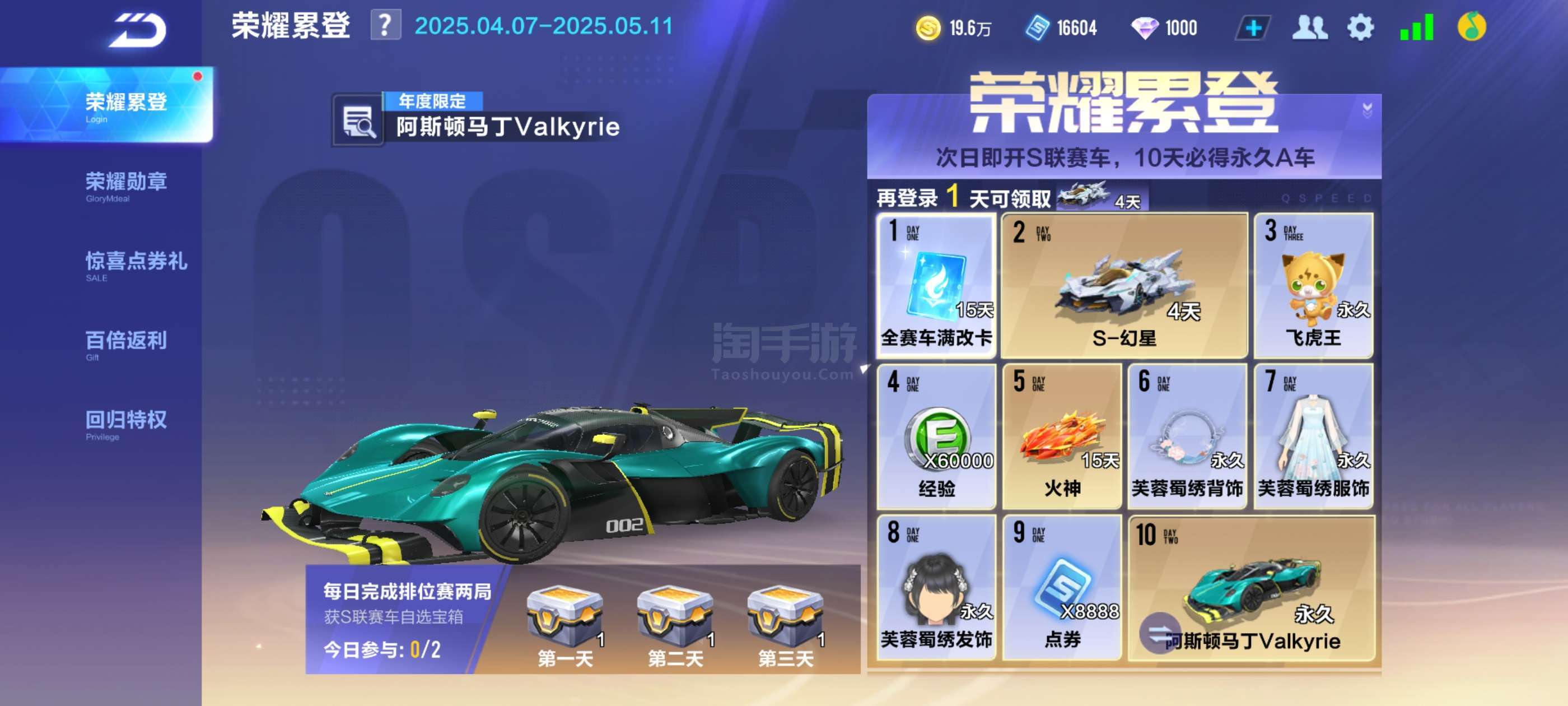 永久9A,1000钻石,19万金币,1万点券!回归号福利:累登10天领取最强免费A车阿斯顿马丁