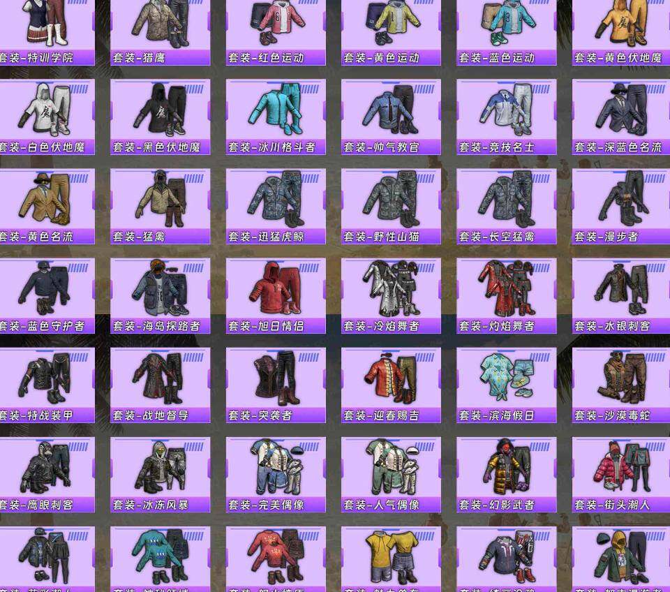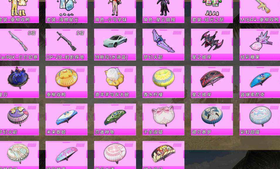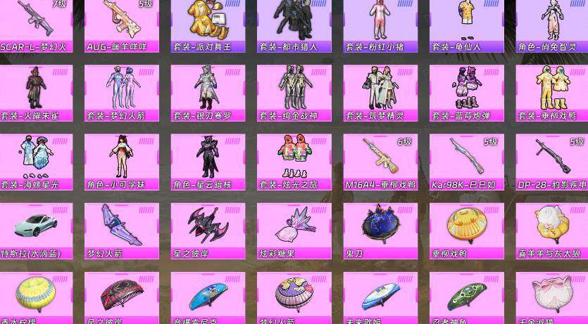 【粉色套装】:粉装-火曜朱雀,粉装-梦幻火箭,粉装-绚金战神,粉装-银刃赛罗,粉装-蓝莓炮弹,粉装-筑梦精灵,粉装-垂柳戏鸭,粉装-海螺星光,角色-小可学妹,粉装-