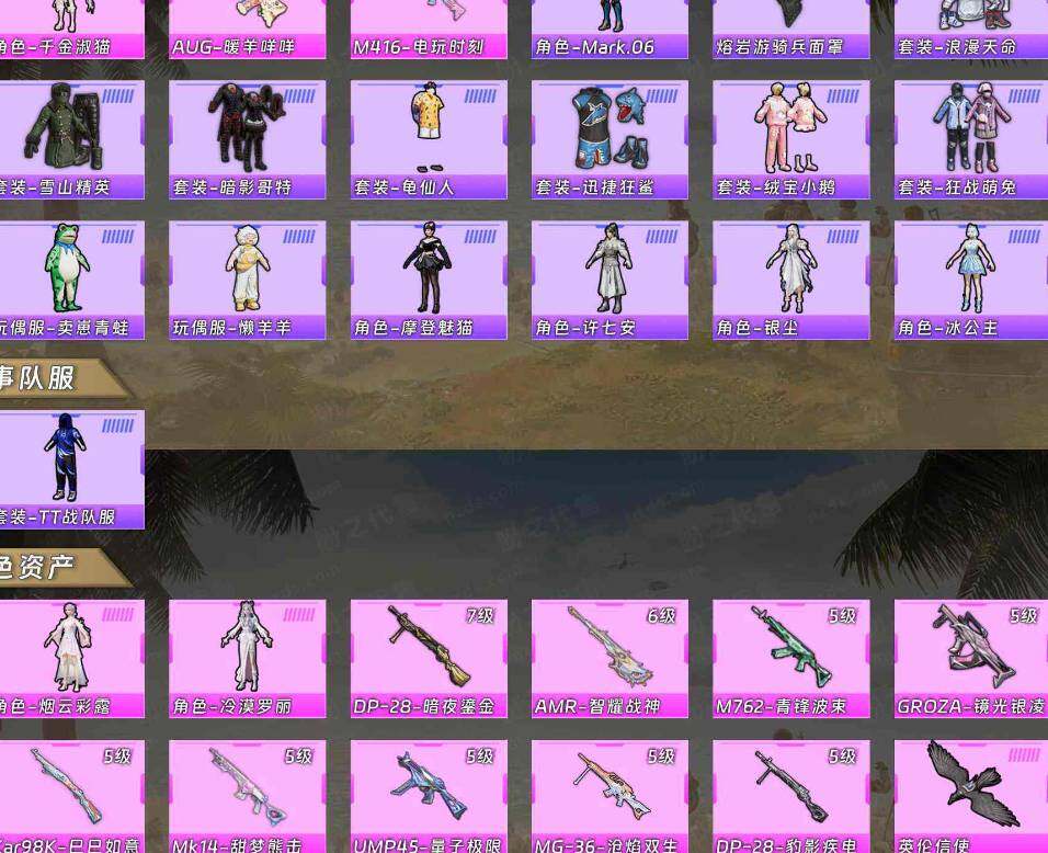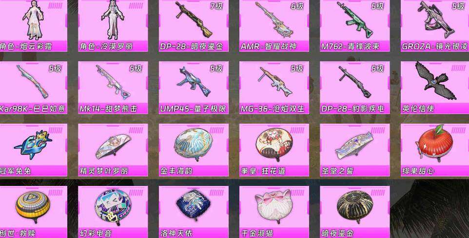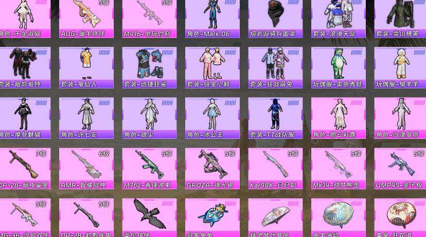 【粉色枪皮等级】:M416-电玩时刻(五级),GROZA-镜光银凌(五级),AUG-暖羊咩咩(五级),M762-
