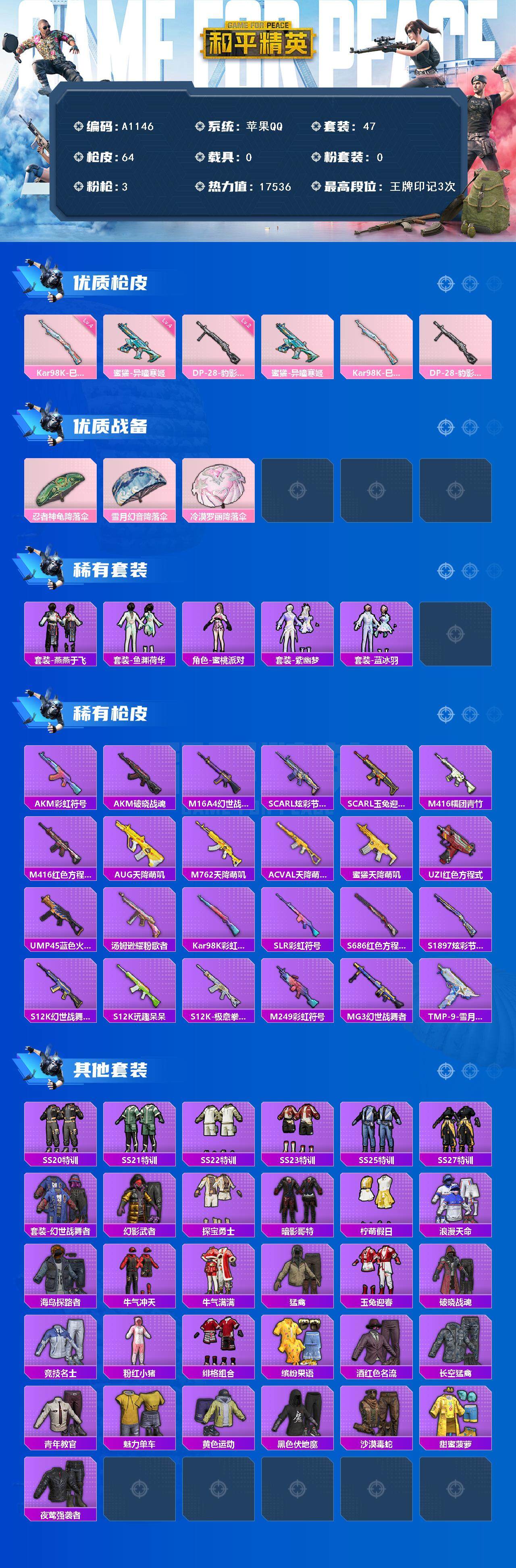 【A1146】苹果 【男神号 浪漫天命/暗影哥特/蜜獾-异瞳寒姬(四级)】手Q-0粉装-3特效枪-0载具-1粉色飞行器-17536热力值-3王牌印记-47套装-64枪皮